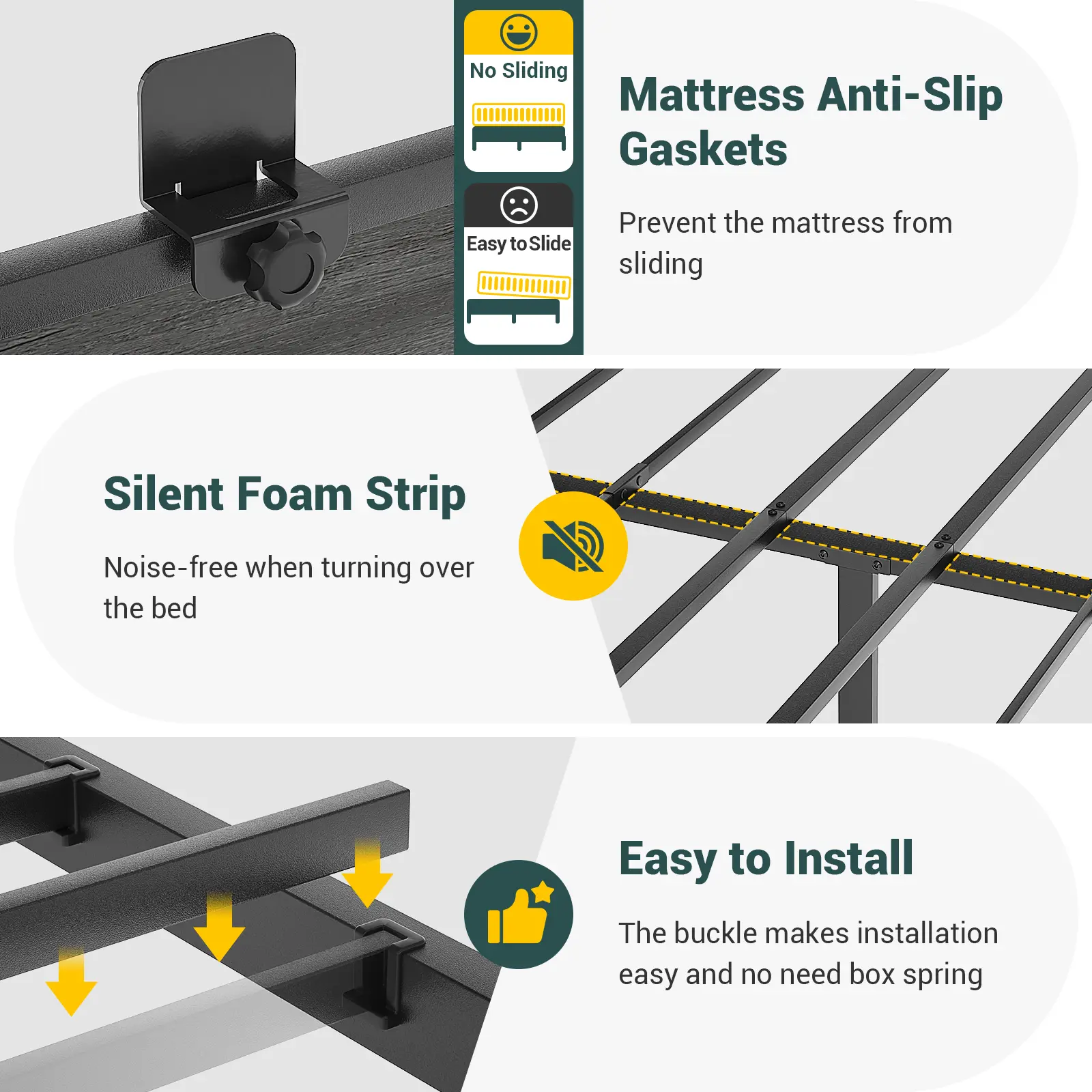 ·Sturdy Construction & Noise-Free Design - The bed frame is made of heavy-duty metal slats and steel legs, eliminating the need for springs. It is capable of supporting up to 1000 pounds, ensuring durability and stability. The silent foam strip beneath the center bar prevents any noise or disturbance caused by metal-to-mattress contact, creating a quiet sleeping environment. The metal bed frame is suitable for kids, adults, and couples in bedrooms, guest rooms, dorms, and children's rooms.