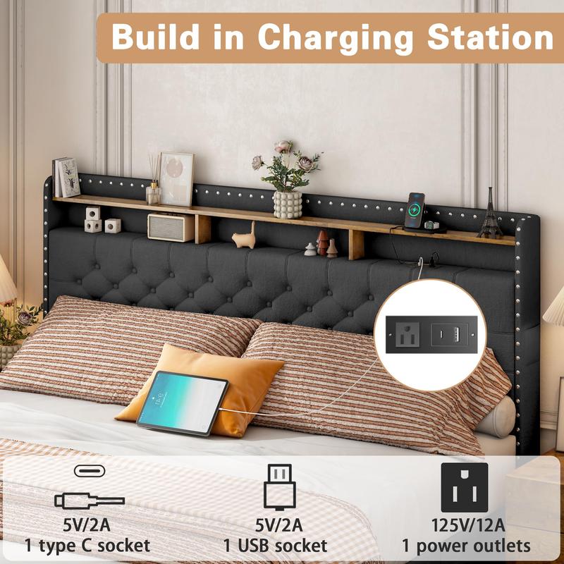 Β·CHARGING STATION AND 2 -TIER STORAGE SHELF: The headboard's built-in charging station includes multiple USB ports and outlets, allowing you to charge multiple devices at once. It fixes the low battery issue with your devices while you're resting on the bed. The shelf makes it simple to turn off the alarm clock and allows you to conveniently locate common goods like your phone, glasses, and other items from the comfort of your bed. Maintaining cleanliness is aided by using this bed frame style.