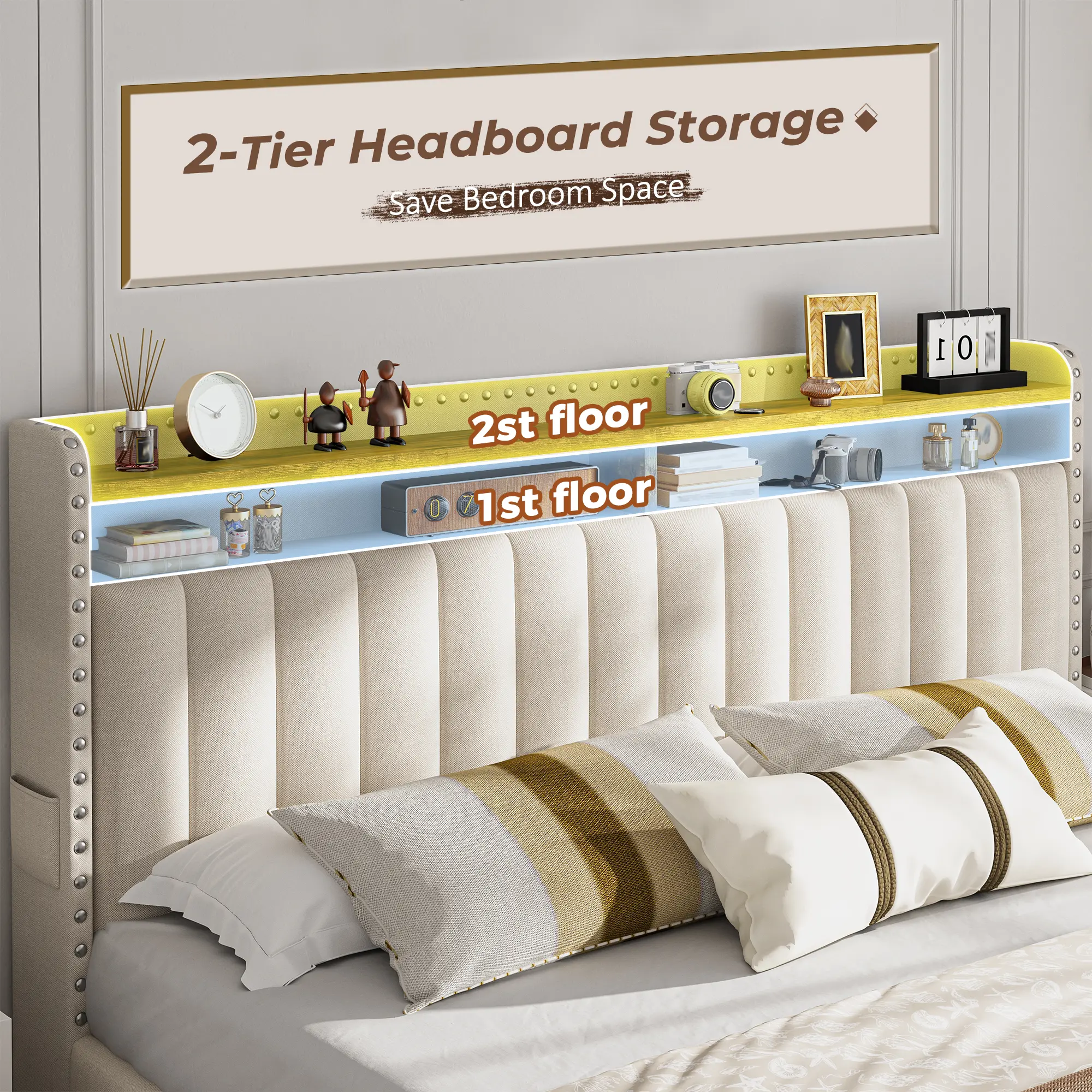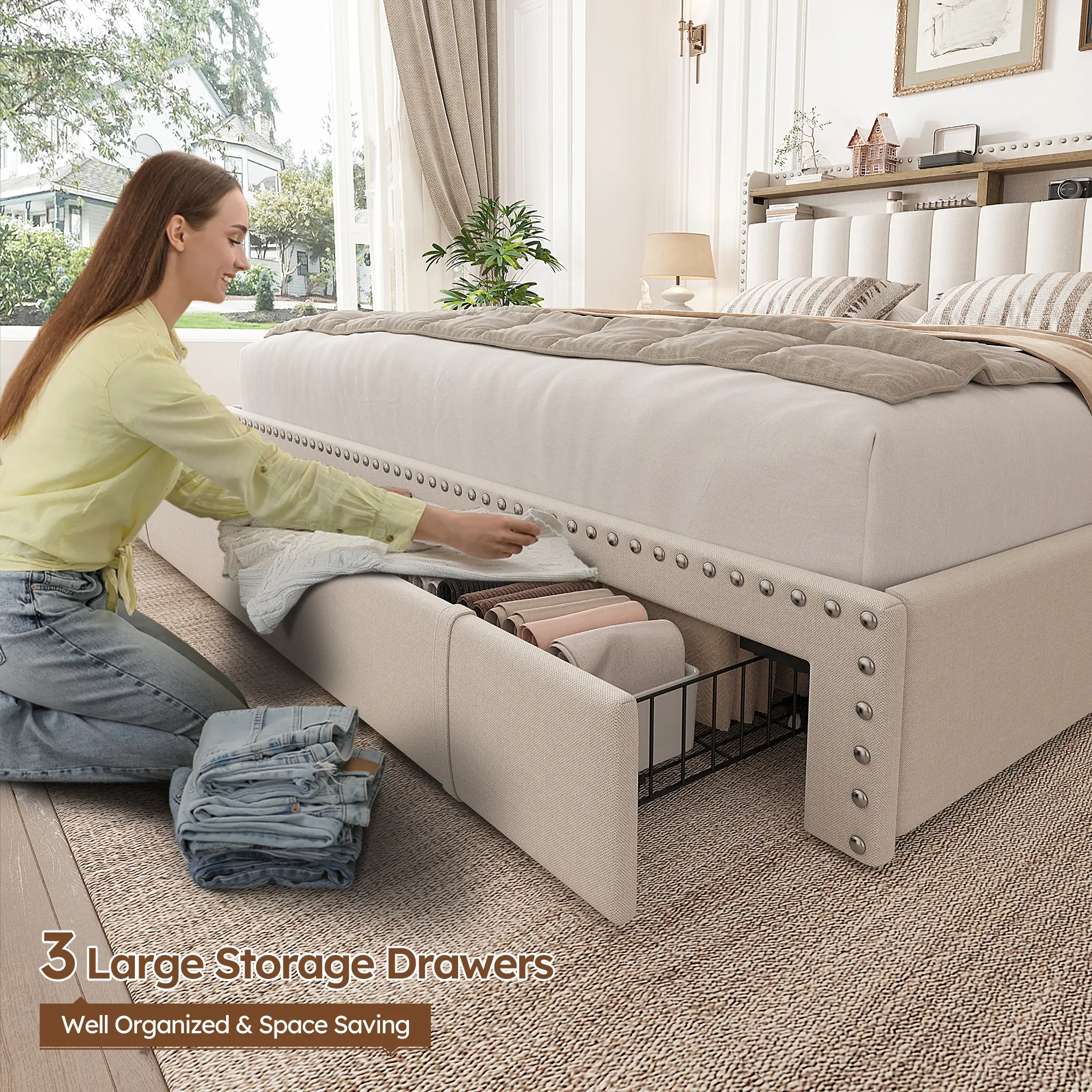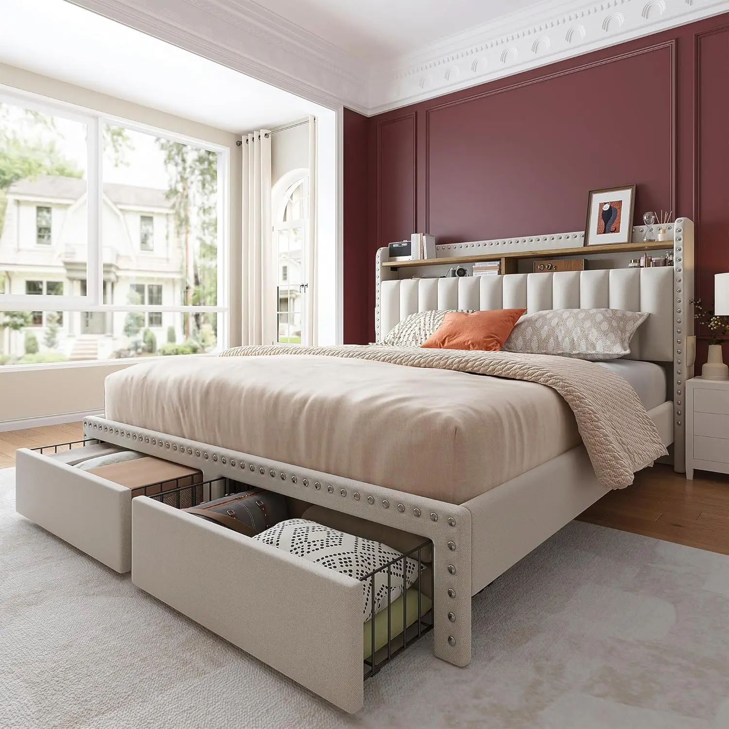 3 Storage Drawers & Built-in Shelves Two large storage drawers hold up to 20 gallons, perfect for clothes or bedding. The headboard shelves keep essentials like your phone, alarm clock, and books within reach.