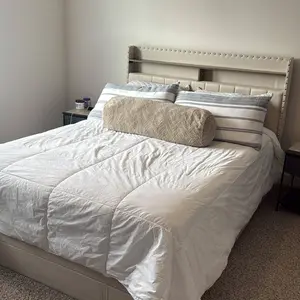 Stylish Design The rivet design and upholstered headboard add style and comfort. Matches any decor.