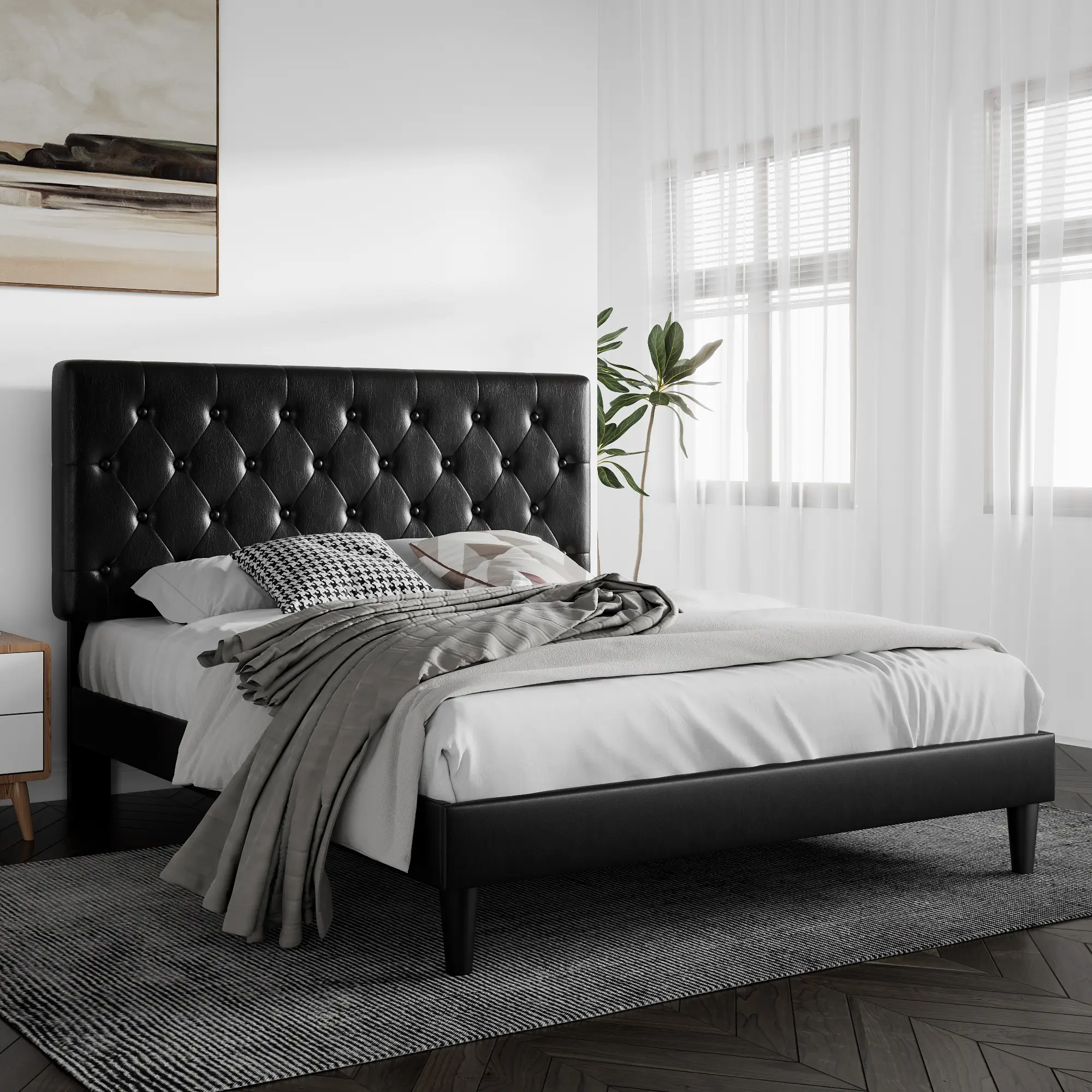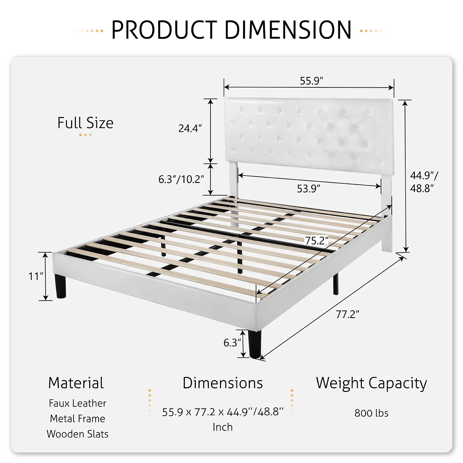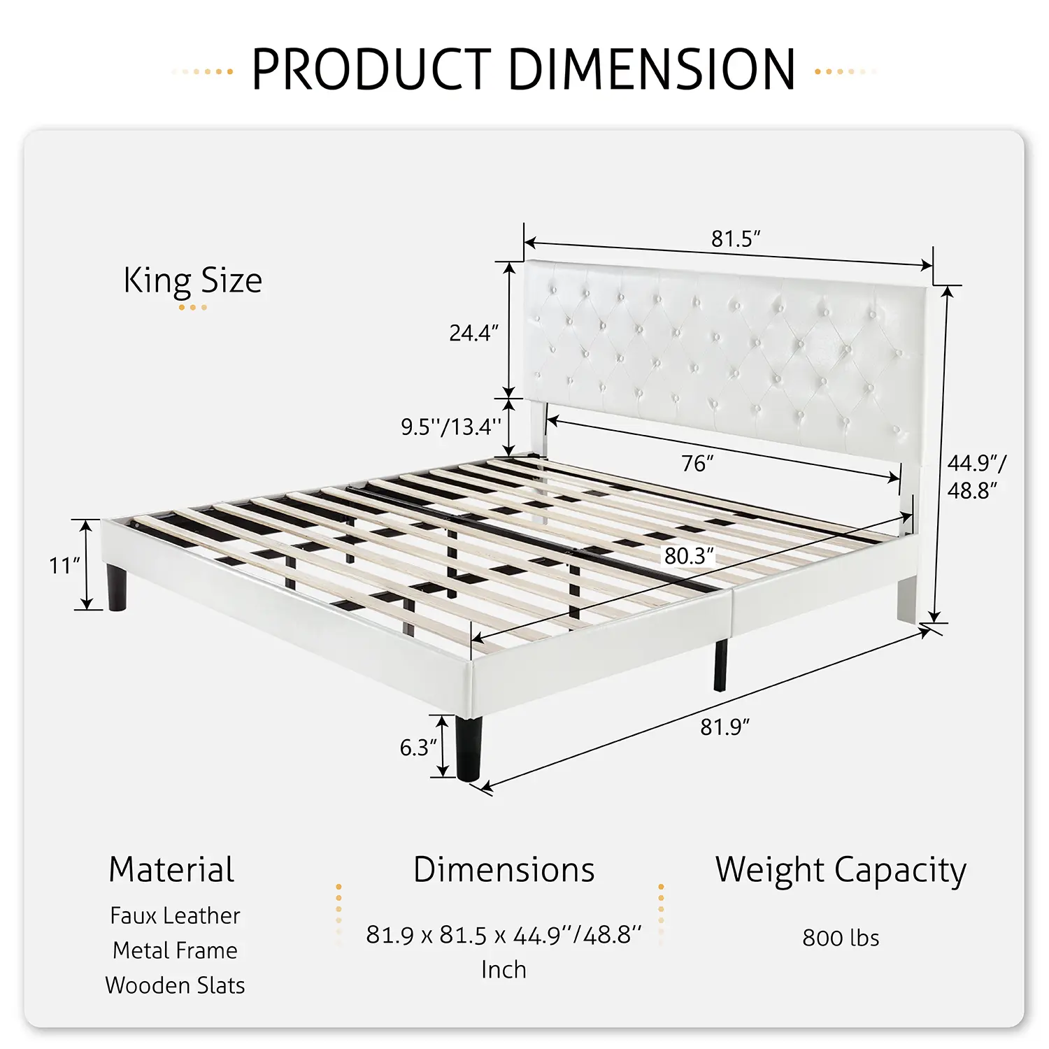 ·【HIGH-QUALITY Leather】Classic button-tufted design with high-end leather and fully Stuffed Padding, this bed frame can perfectly fit into your master bedroom or teenager's room. You may rest assured that all materials passed all safety tests before out of the market. Easy to clean, maintenance-free!