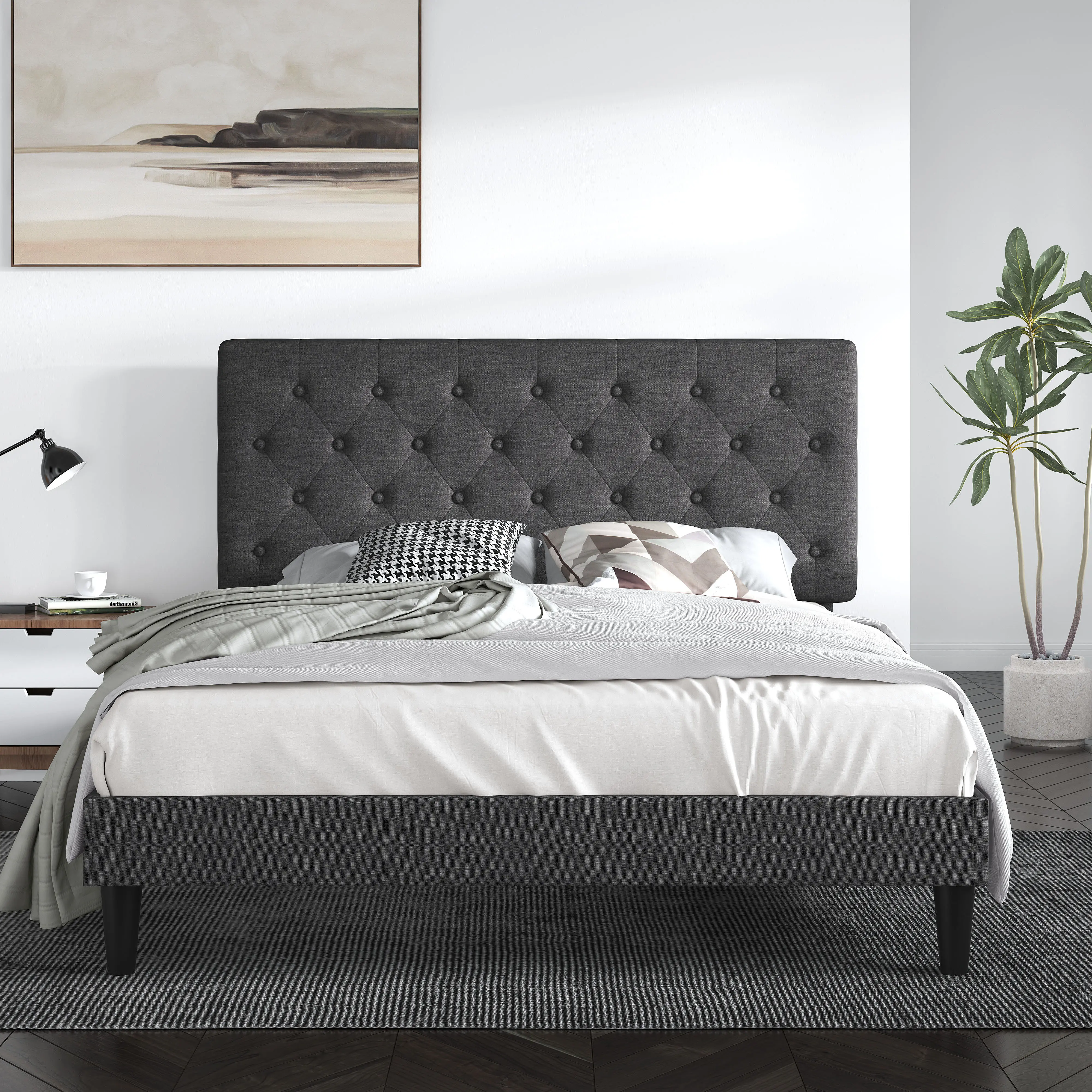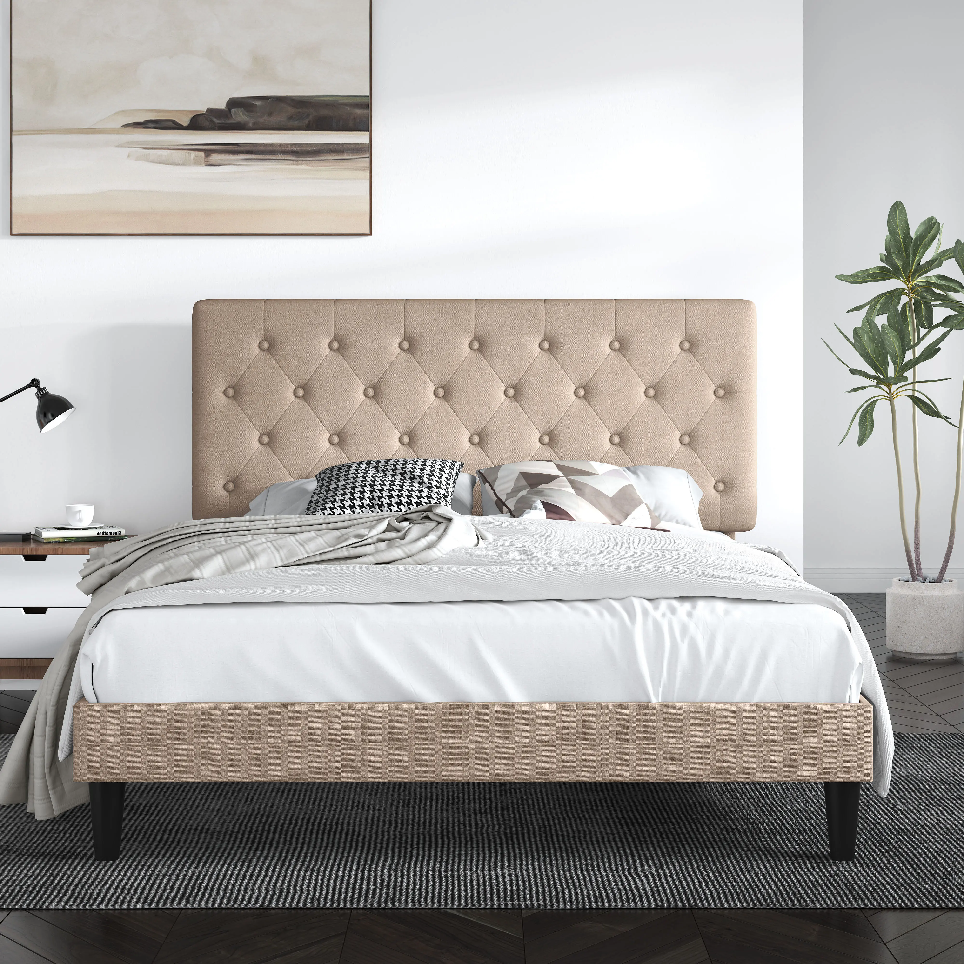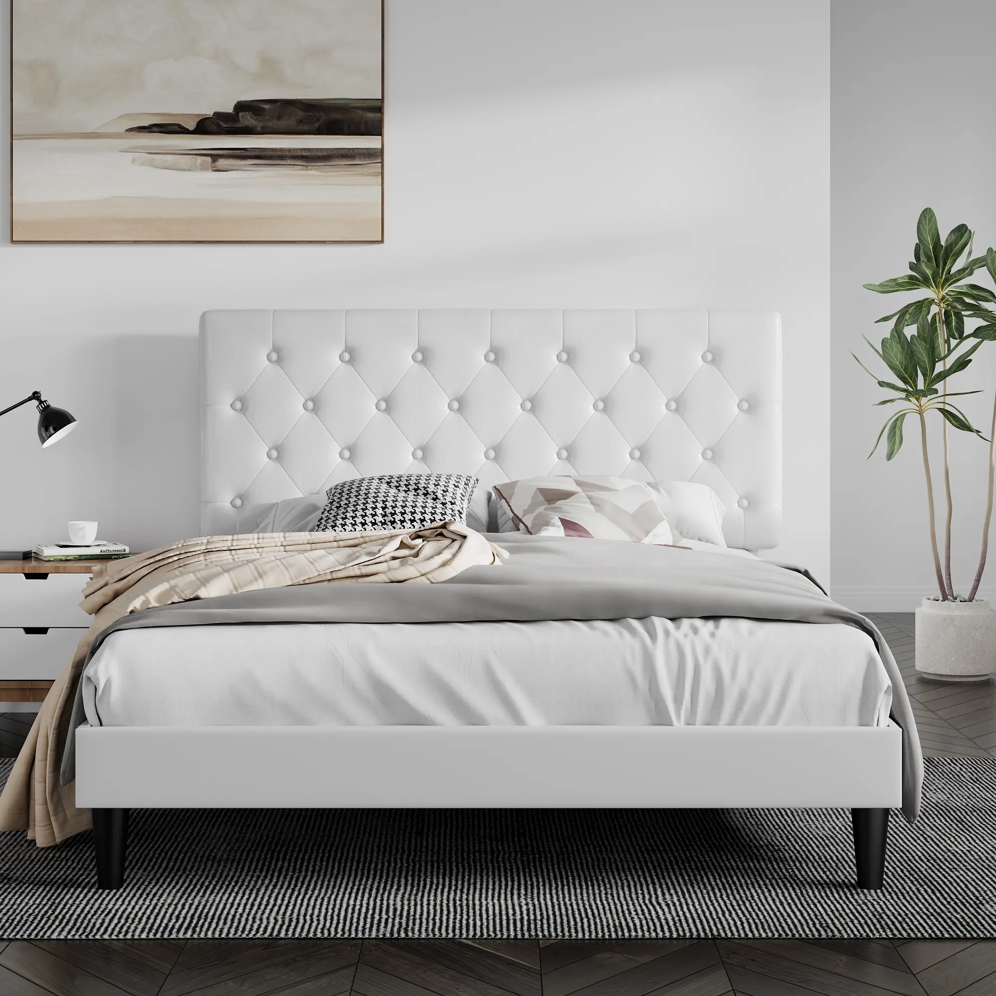 ·【HIGH-QUALITY Leather】Classic button-tufted design with high-end leather and fully Stuffed Padding, this bed frame can perfectly fit into your master bedroom or teenager's room. You may rest assured that all materials passed all safety tests before out of the market. Easy to clean, maintenance-free!