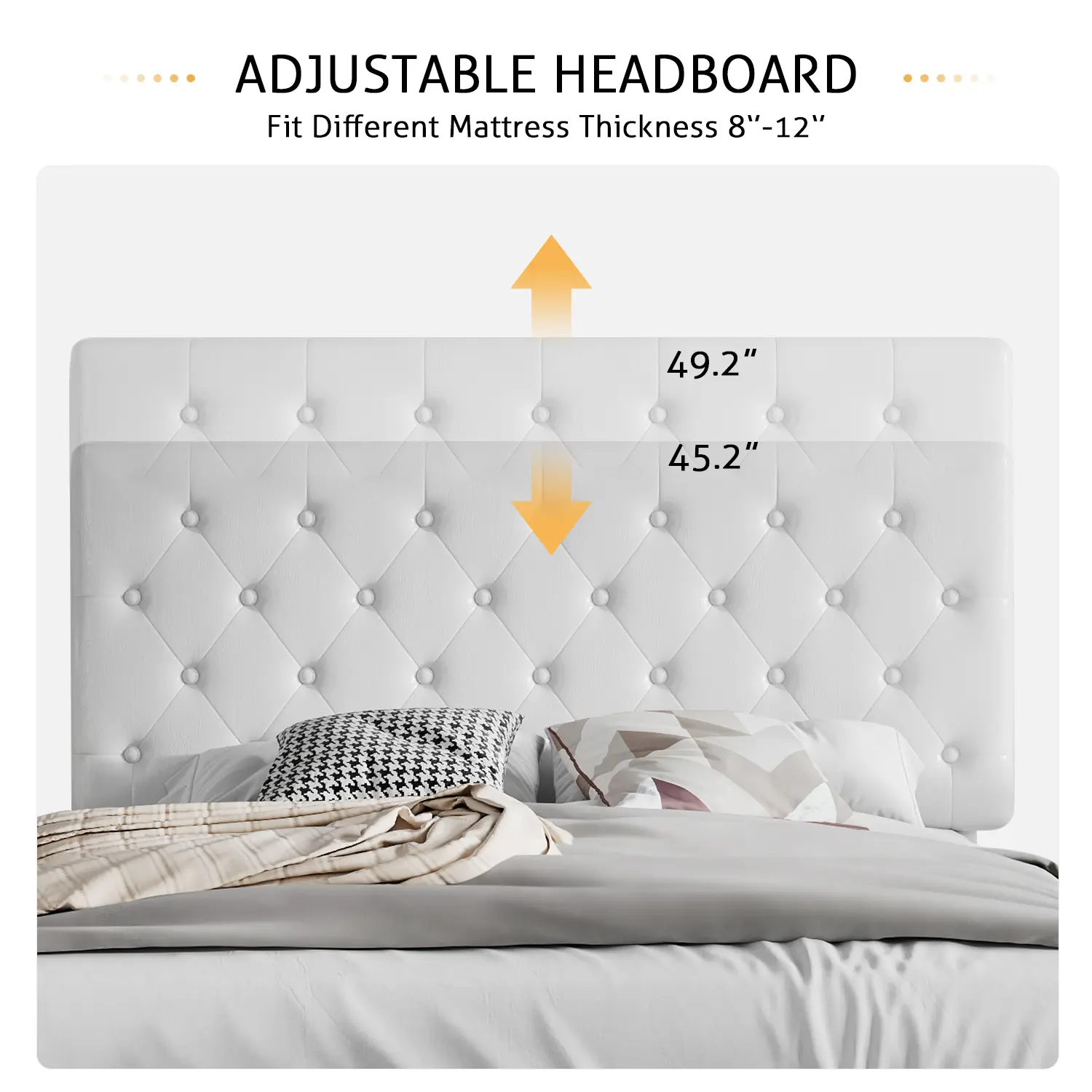 ·【ADJUSTABLE HEADBOARD】45.2" / 49.2" adjustable headboard gives you more selection for mattress thickness. Save you lots of time for mattress online shopping, the gap between slats to a headboard is 10” to 14”. Suitable mattress thickness: 8”-14” recommended (Box Spring is optional). The mattress is not included.