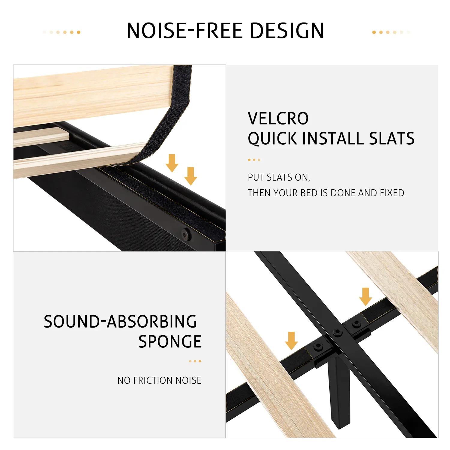 ·【NOISE FREE DESIGN】We use velcro strips under all the slats to prevent friction squeaking between wooden slats and metal frames. Make sure you have a good sleeping night and relaxing time!