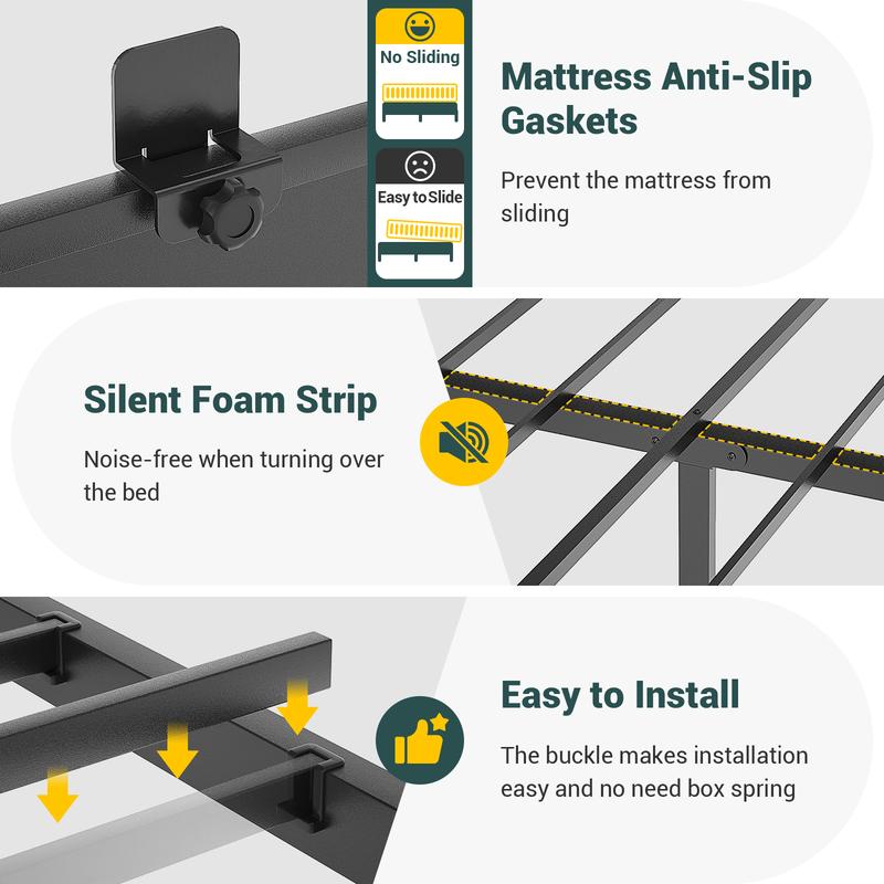 Crafted with heavy-duty metal slats and steel legs, this bed frame supports up to 1,000 pounds, ensuring durability and stability without the need for a box spring. The silent foam strip beneath the center bar eliminates noise from metal-to-mattress contact, guaranteeing a peaceful night's sleep. Ideal for bedrooms, guest rooms, dorms, and children's rooms.