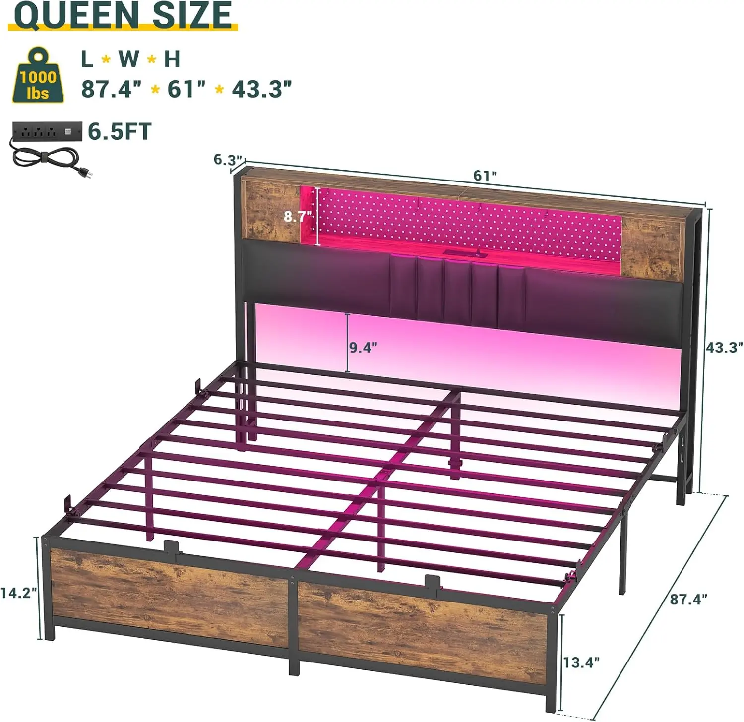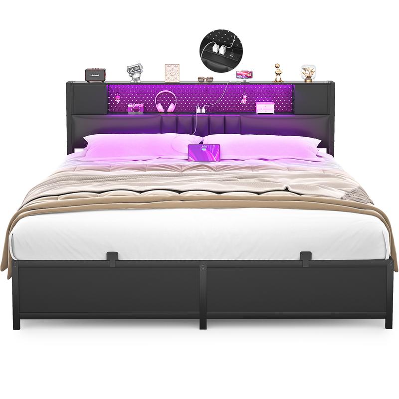 Our well-designed headboard includes spacious open shelves and two private storage cabinets with doors, providing ample space to organize your phone, books, decorations, or other essentials. Equipped with a metal pegboard for magnetic decorations and four hooks to hang headphones or accessories, it combines functionality with style.