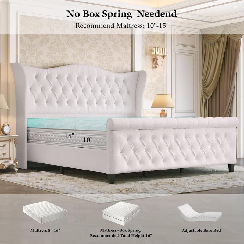 ·Handcrafted Luxury & Lasting Strength: Each button tufted detail is expertly handcrafted by skilled artisans, adding timeless elegance and luxury to your bedroom. Cream bed frame king with premium materials for a refined, plush look. The king bed frame and tall headboard is built to last, featuring a solid wood slat system and reinforced solid wood legs for exceptional stability and quiet. Designed with 12 sturdy wooden slats and 6 support legs, it can hold up to 1200 lbs