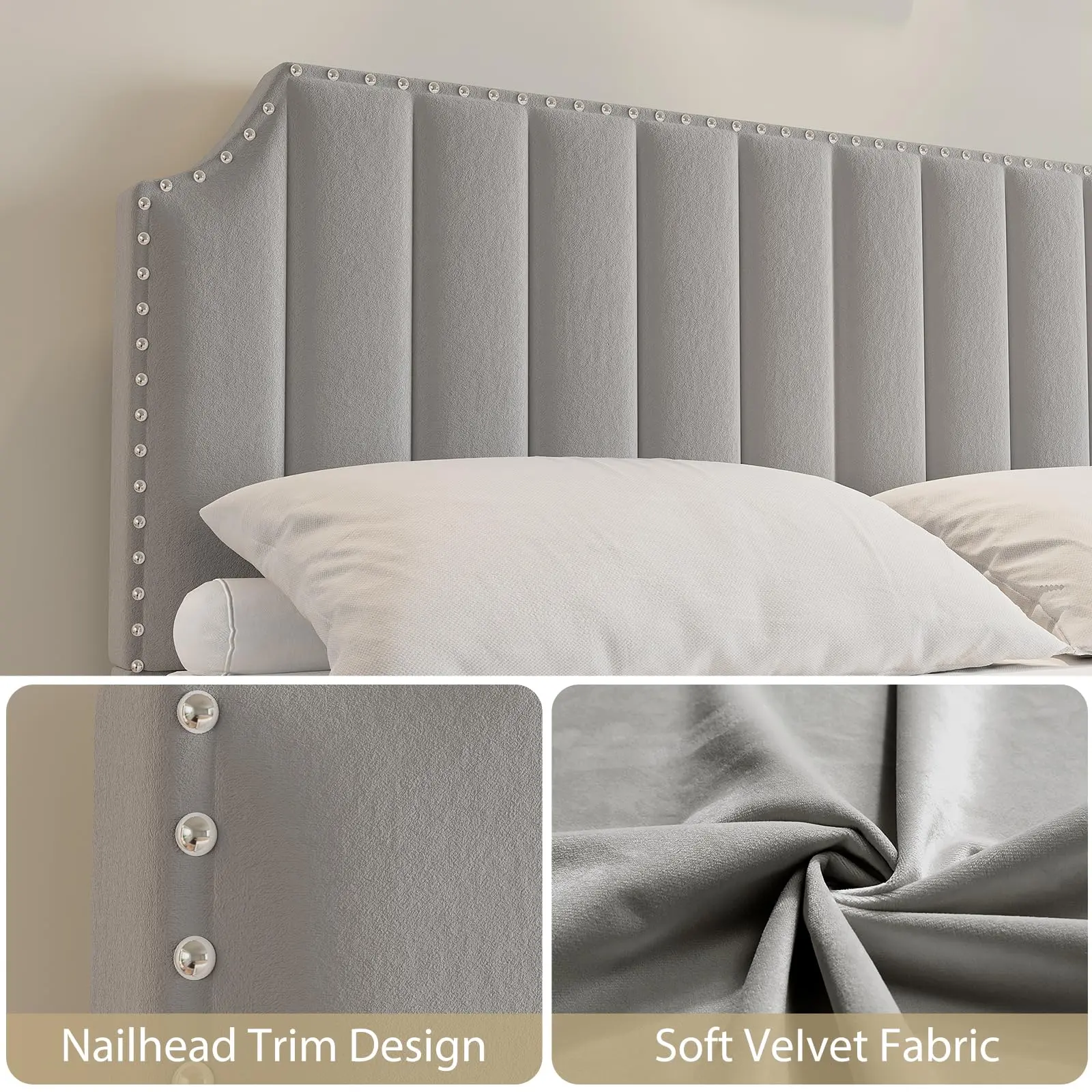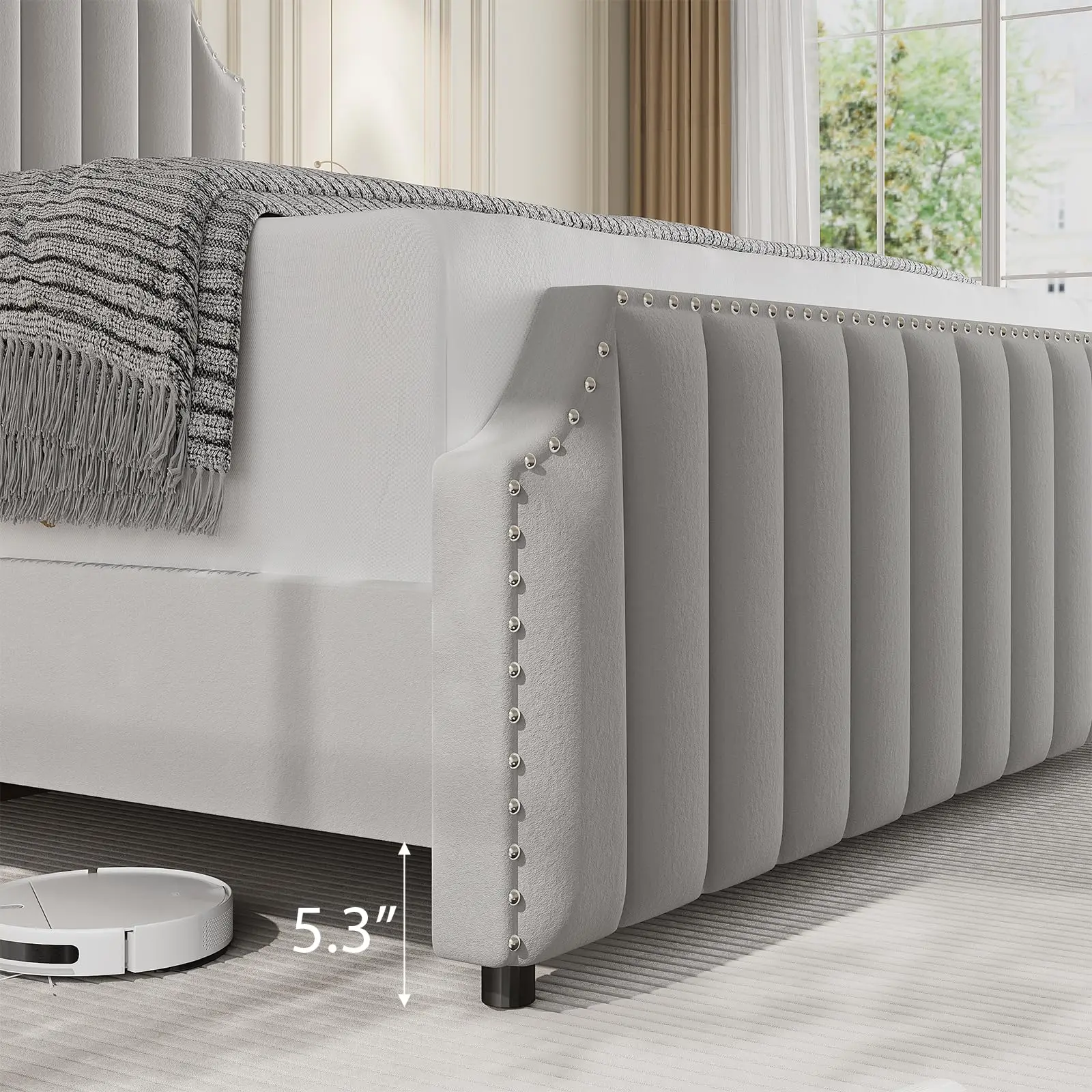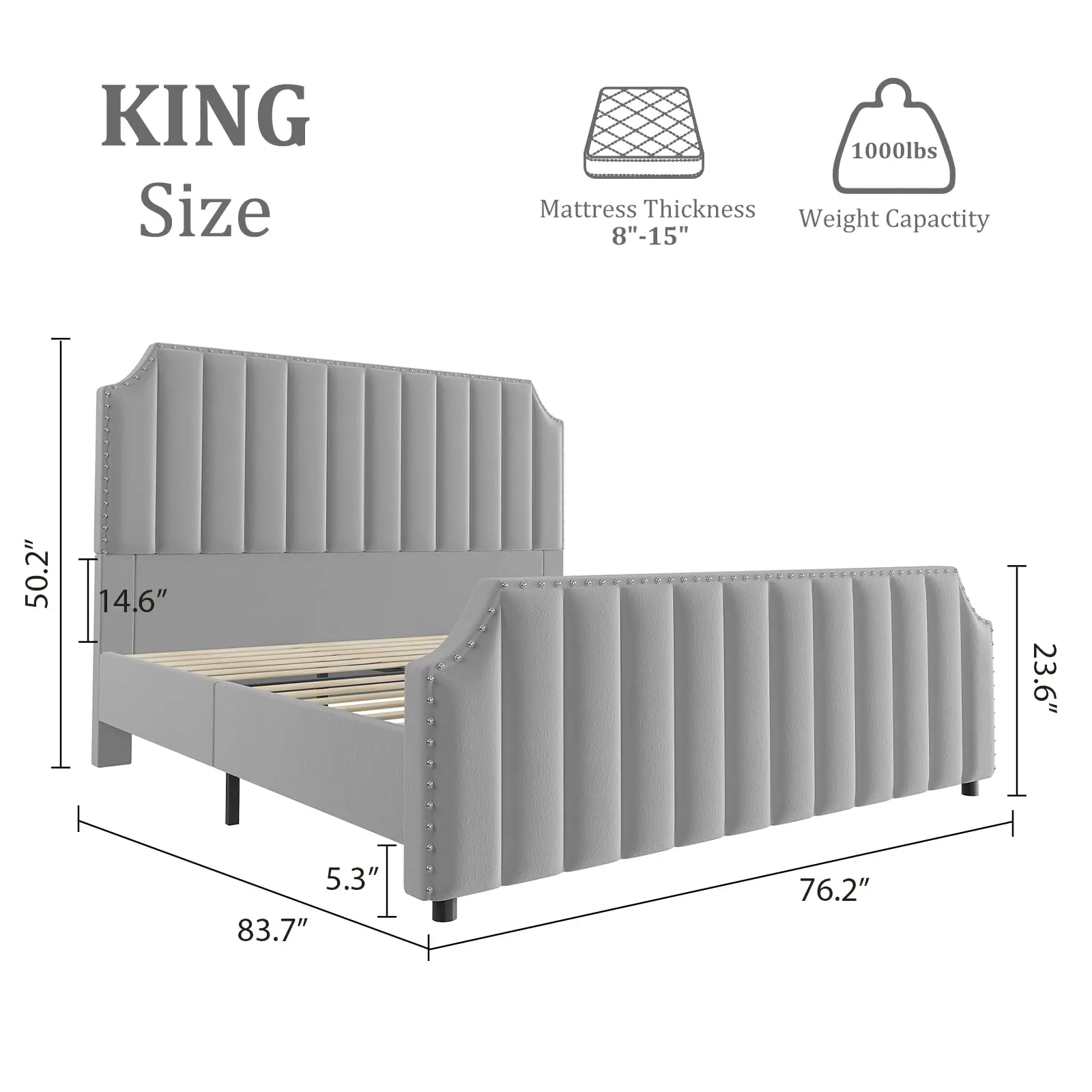 ·Elegant Headboard & Footboard – This king bed frame features a stunning 50.2" headboard and 23.6" footboard with chic vertical channel tufting and sleek nailhead trim, giving your bedroom a high-end, royal vibe.