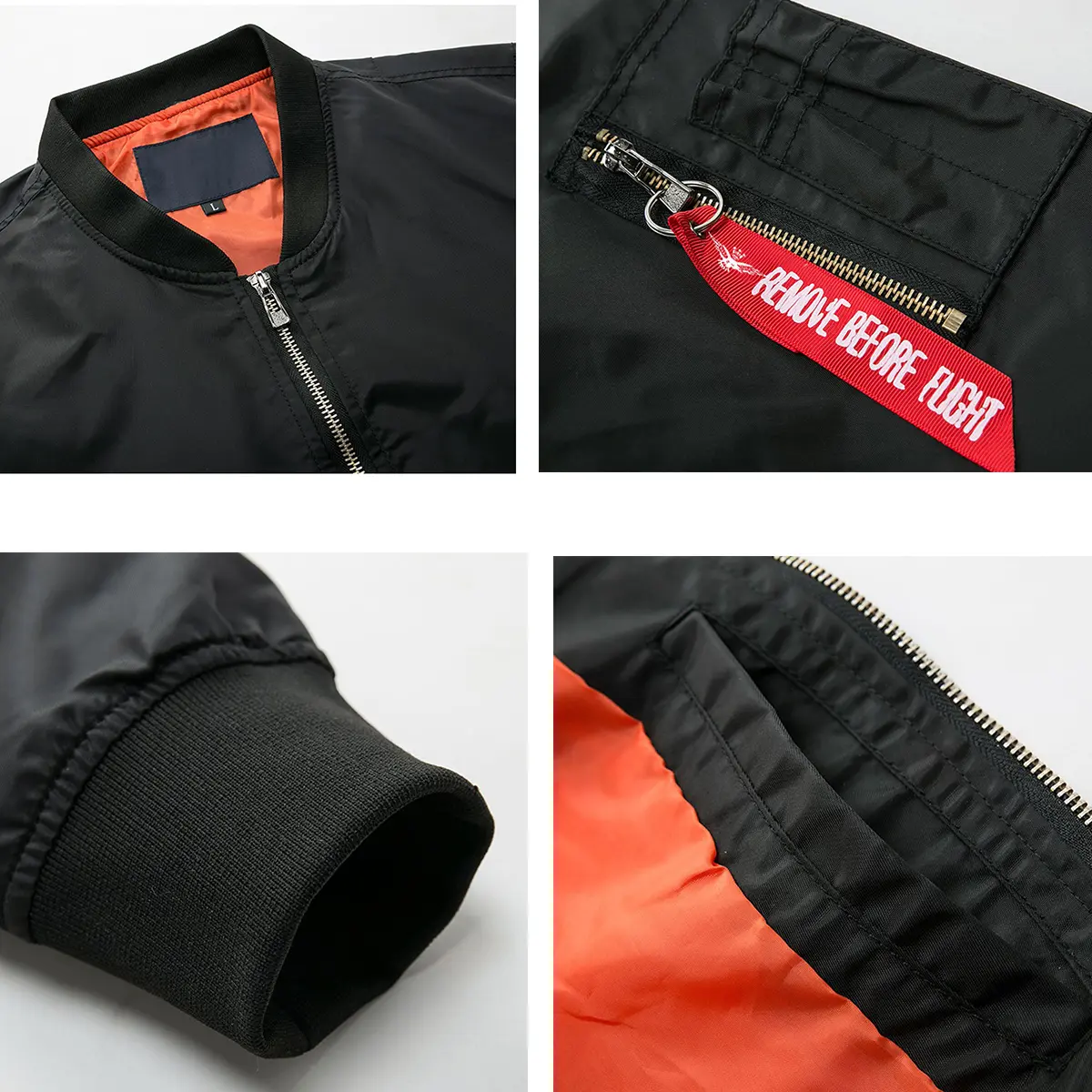 This Kingapril Men's Lightweight Varsity Jacket is a casual windbreaker bomber. It features a zipper closure and long sleeve stand collar. Perfect for spring outdoor activities, it offers a short solid color military lightweight design. The jacket includes two side pockets, one inside pocket, and one pocket on sleeves.