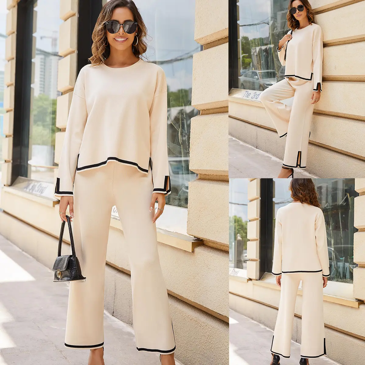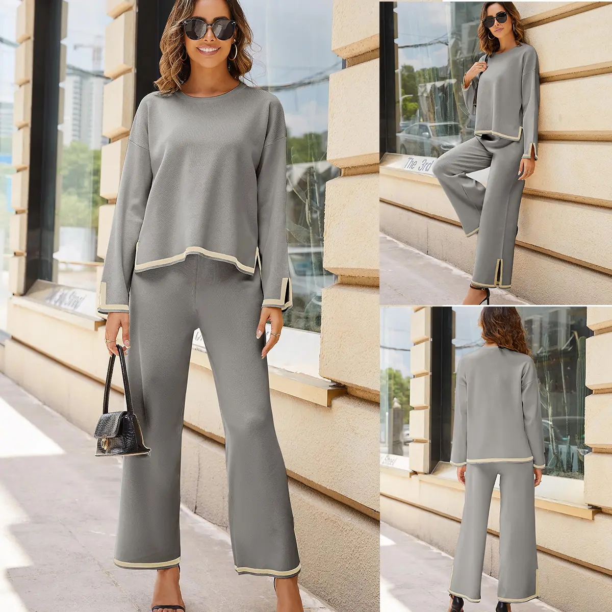 ·Sweater top: Long sleeves, crew neck, drop shoulder, split hem.