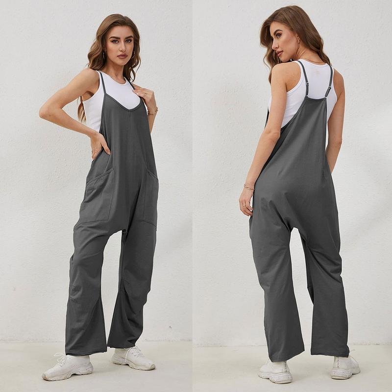 Design details:Adjustable shoulder straps, deep v neckline, low crotch design, wide leg design with two large side pockets.