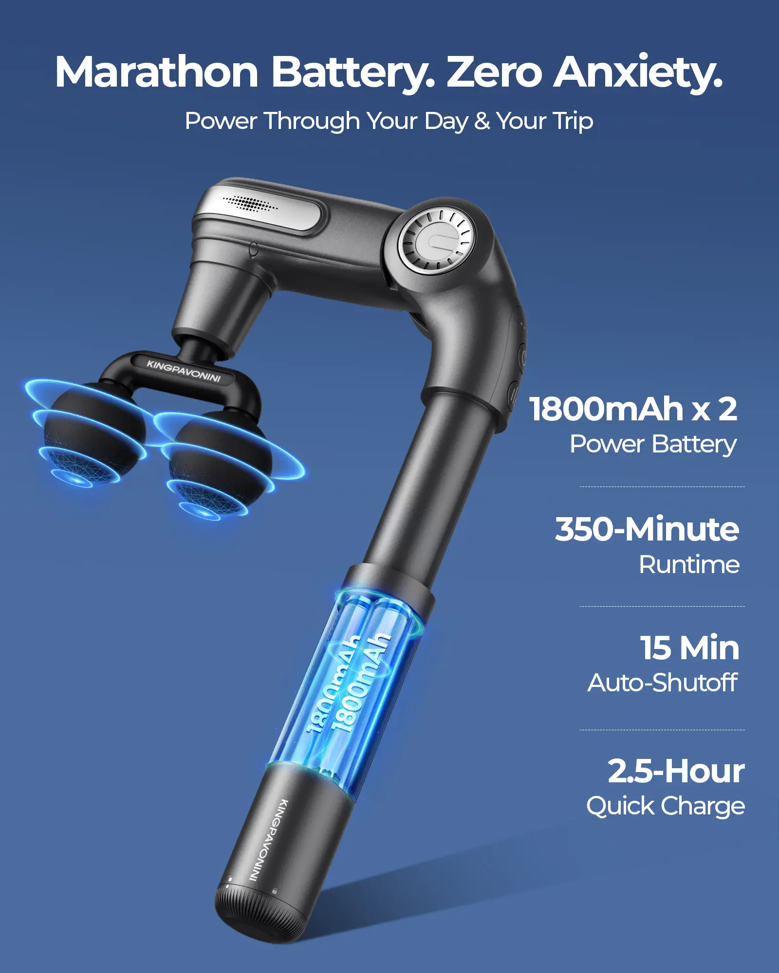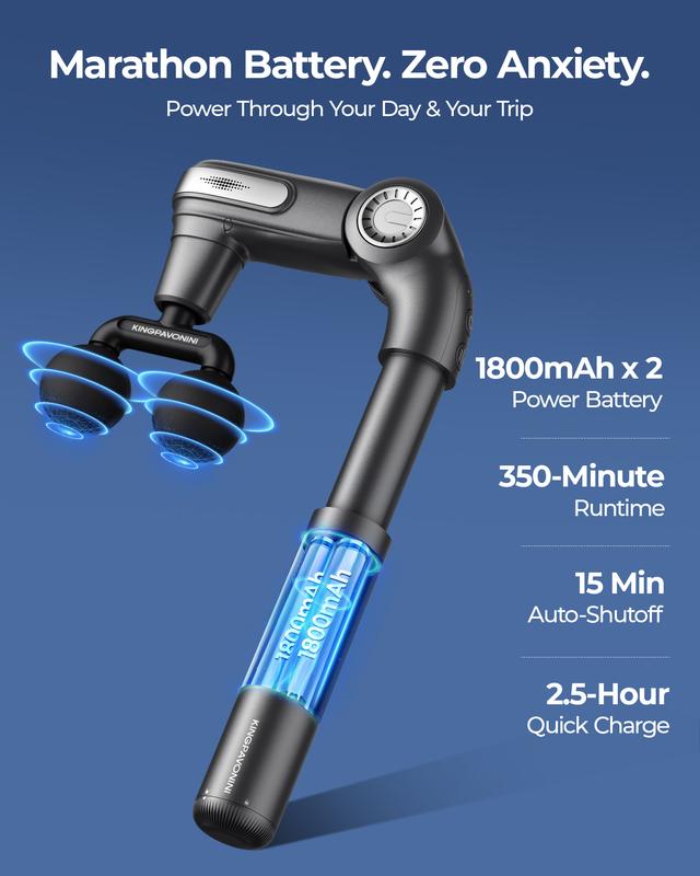Upgraded Dual-Ball Head — Double Coverage, Faster Recovery:KingPavonini handheld massage gun with all-new dual-ball design doubles the efficiency — covering twice the area of a single head, soothing more areas in less time;