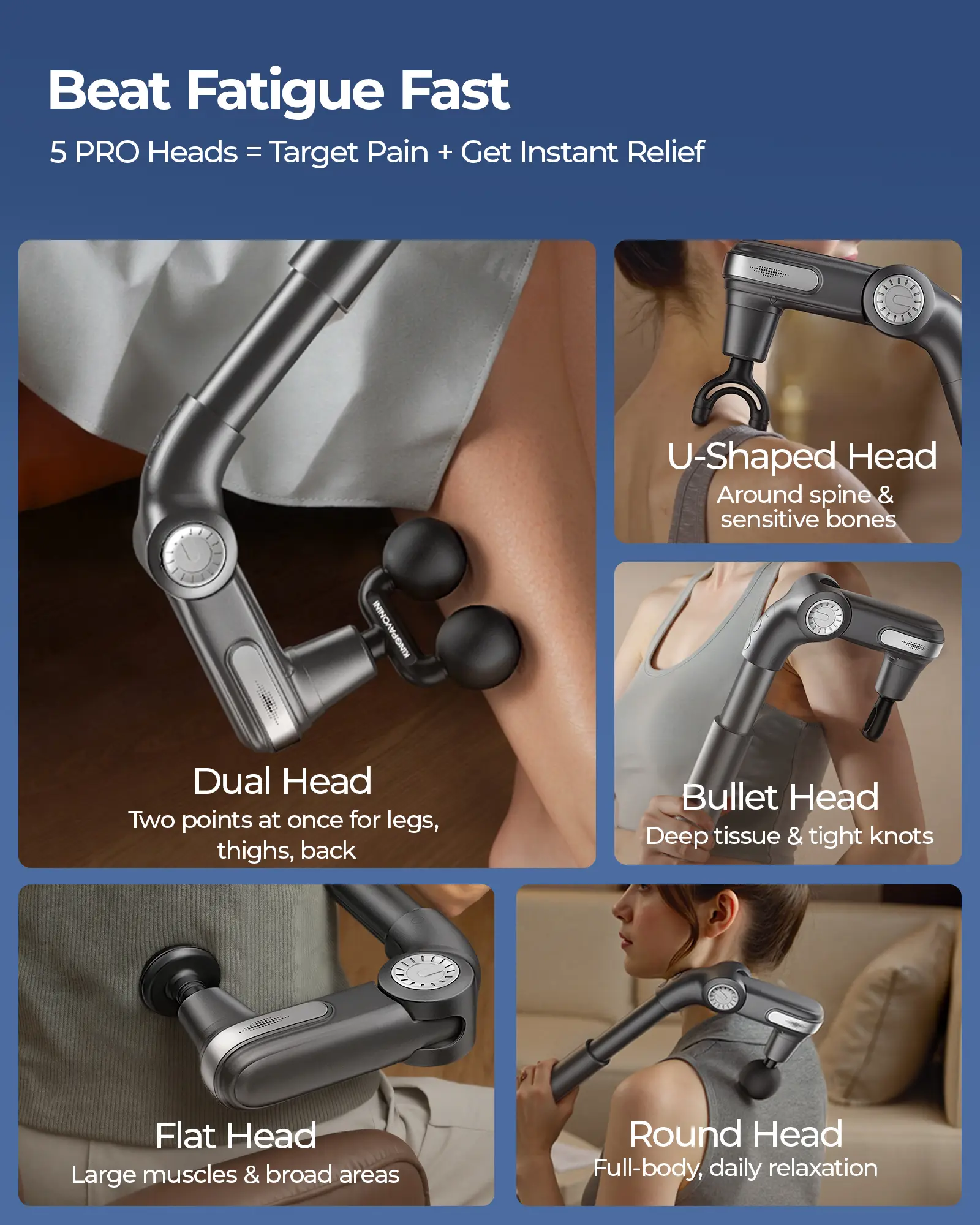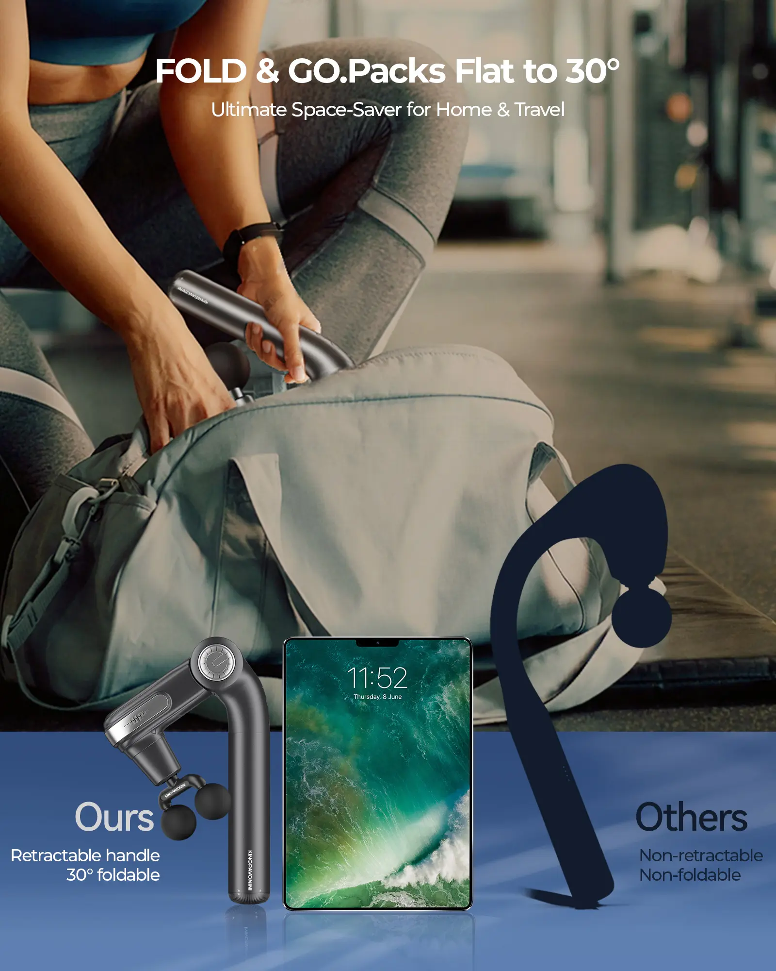 Space-Saving Fold — Portable Comfort On the Go:This foldable back massage gun is designed for life on the go with an innovative, space-saving foldable design; slide it into your gym bag for post-workout recovery, pack it in your suitcase to relieve travel tension, or tuck it into your desk drawer for a quick refresh between meetings; compact, powerful relief—always within reach