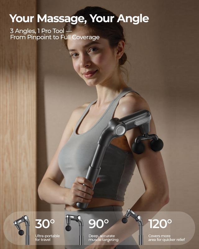 3 Angles — Precision Hits or All-Around Relief:Our massager gun locks into 3 precise angles to deliver targeted relief wherever you need it; crank to 90° for deep, focused pressure that blasts stubborn knots in shoulders and glutes, switch to 120° for broad, sweeping relief across your back and thighs, or fold to 30° for compact storage that goes anywhere; every angle puts you in control—customize intensity and reach to create your perfect recovery experience