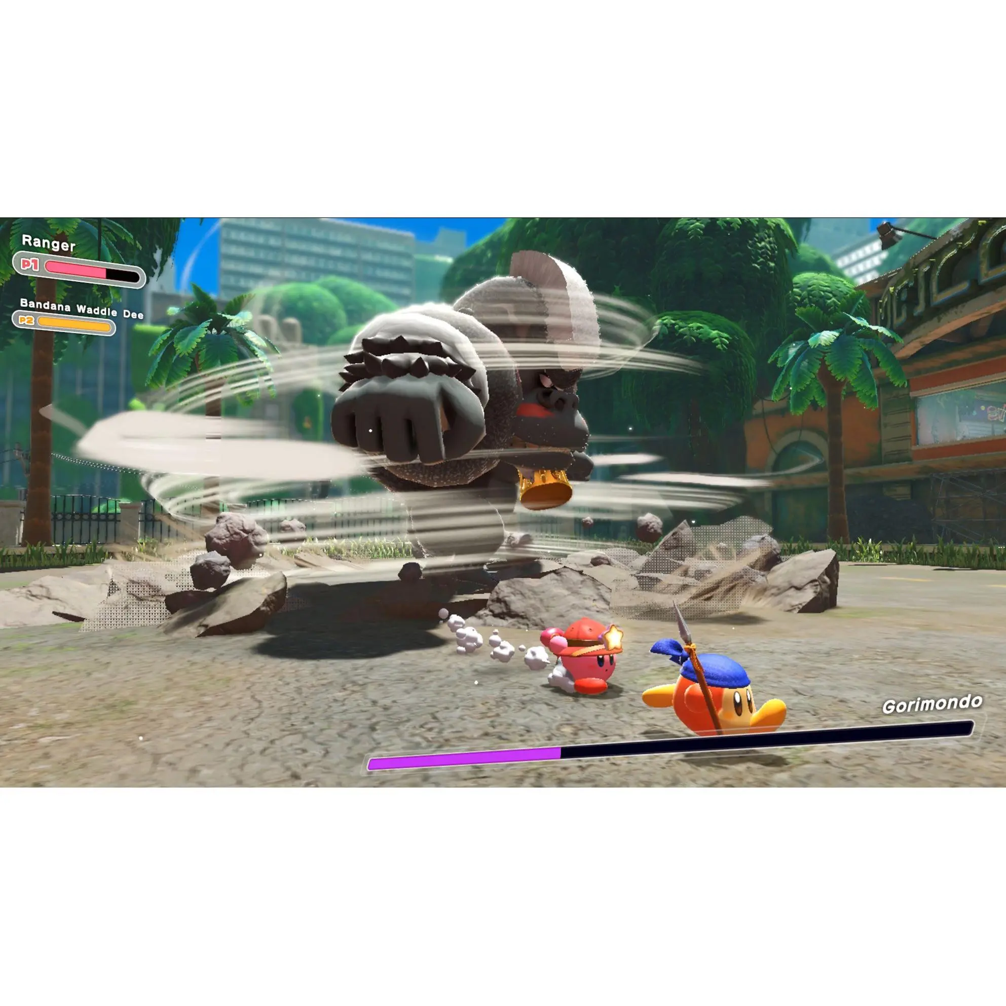 Join up with a pointy partner, Bandana Waddle Dee, in co-op play. Pass a Joy-Con controller to a buddy to play as the spear-wielding Bandana Waddle Dee and help each other explore and battle through this colorful world. While Kirby can float and inhale enemies, Bandana Waddle Dee can spin and stab with his sturdy spear. Find friendship in this forgotten world and save the Waddle Dees! Float over obstacles and fight through enemies on your way to each stage's goal as you slash, poke, freeze, and hammer using Kirby's copy abilities. Each themed stage you travel through will hide several friendly Waddle Dees in peril! Save them to grow the home base of your adventure, the once-deserted Waddle Dee Town. The Waddle Dees you rescue will unlock shops and leaderboards. Rated E10+. From Nintendo.