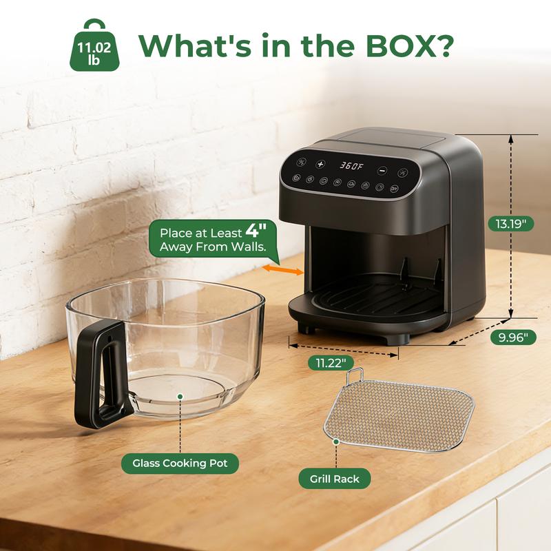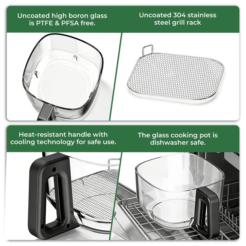 ·Non-Toxic Glass Basket -- Features uncoated high borosilicate glass pot (PTFE/PFSA-free) and sturdy 304 stainless steel grill rack; includes a heat-resistant handle with cooling tech for safe handling, plus the glass pot is dishwasher-safe for easy cleaning