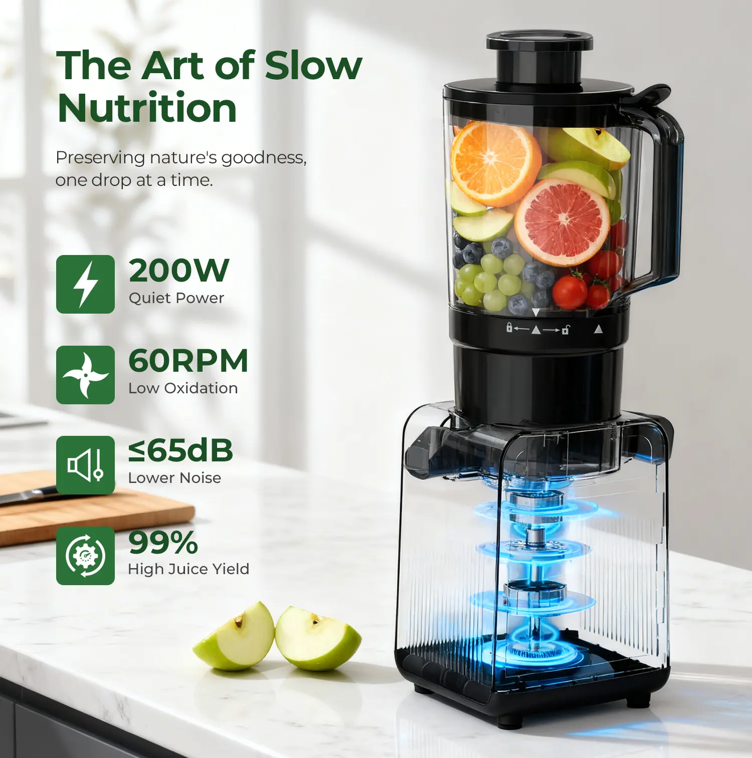 The Kismile Cold Press Juicer Machine boasts a 4.4" wide feed chute, ideal for whole fruits and vegetables. No shredding is needed, ensuring a smooth juicing process. With 60 RPM low-speed technology, it minimizes heat and oxidation, preserving nutrients and natural flavors. This design ensures you get high juice yield without compromising on quality.