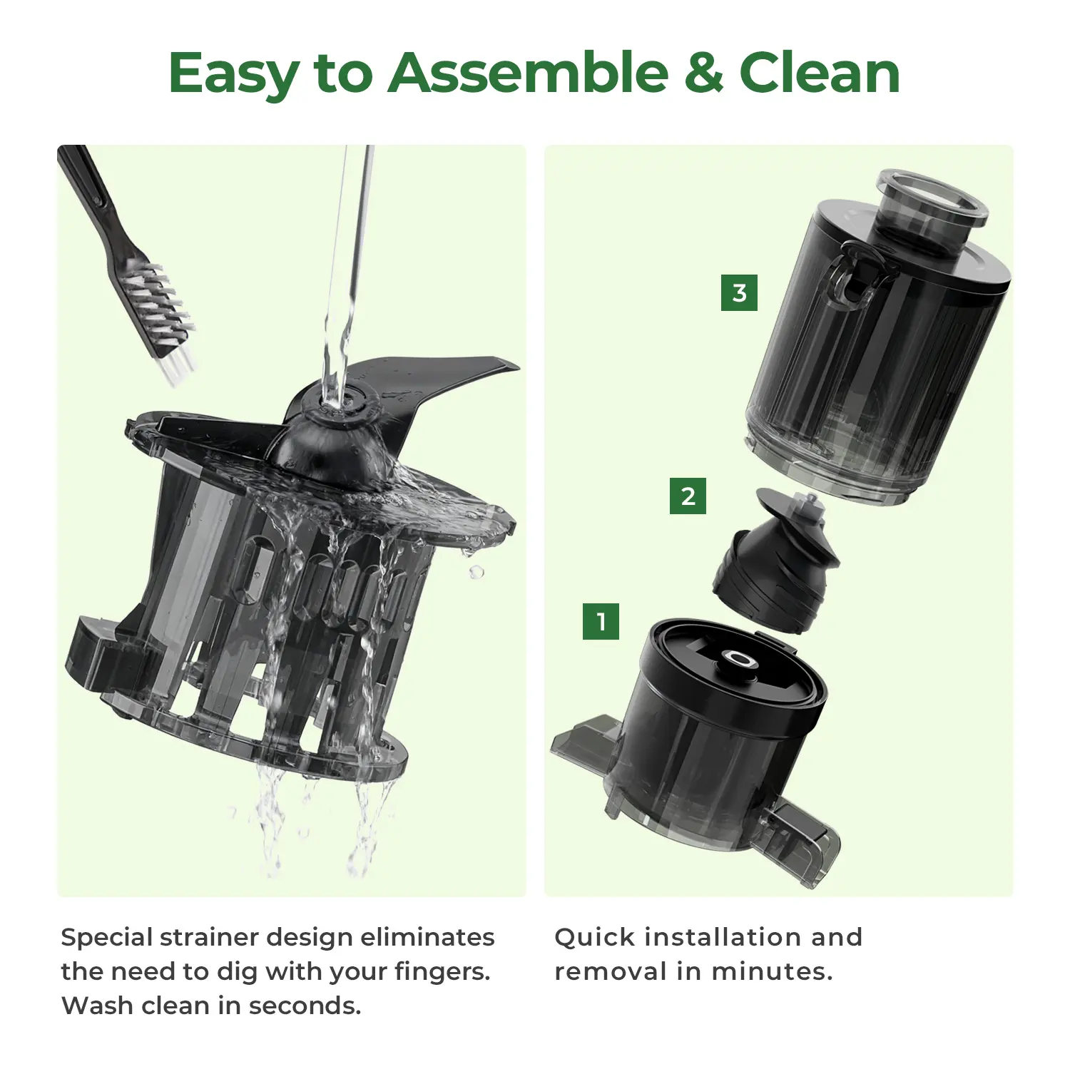 The masticating juicer is designed for quick assembly and disassembly, with only 4 main parts. It includes a cleaning brush for fast cleaning, saving you time and effort. Assembly and disassembly take just seconds, making it convenient for everyday use.