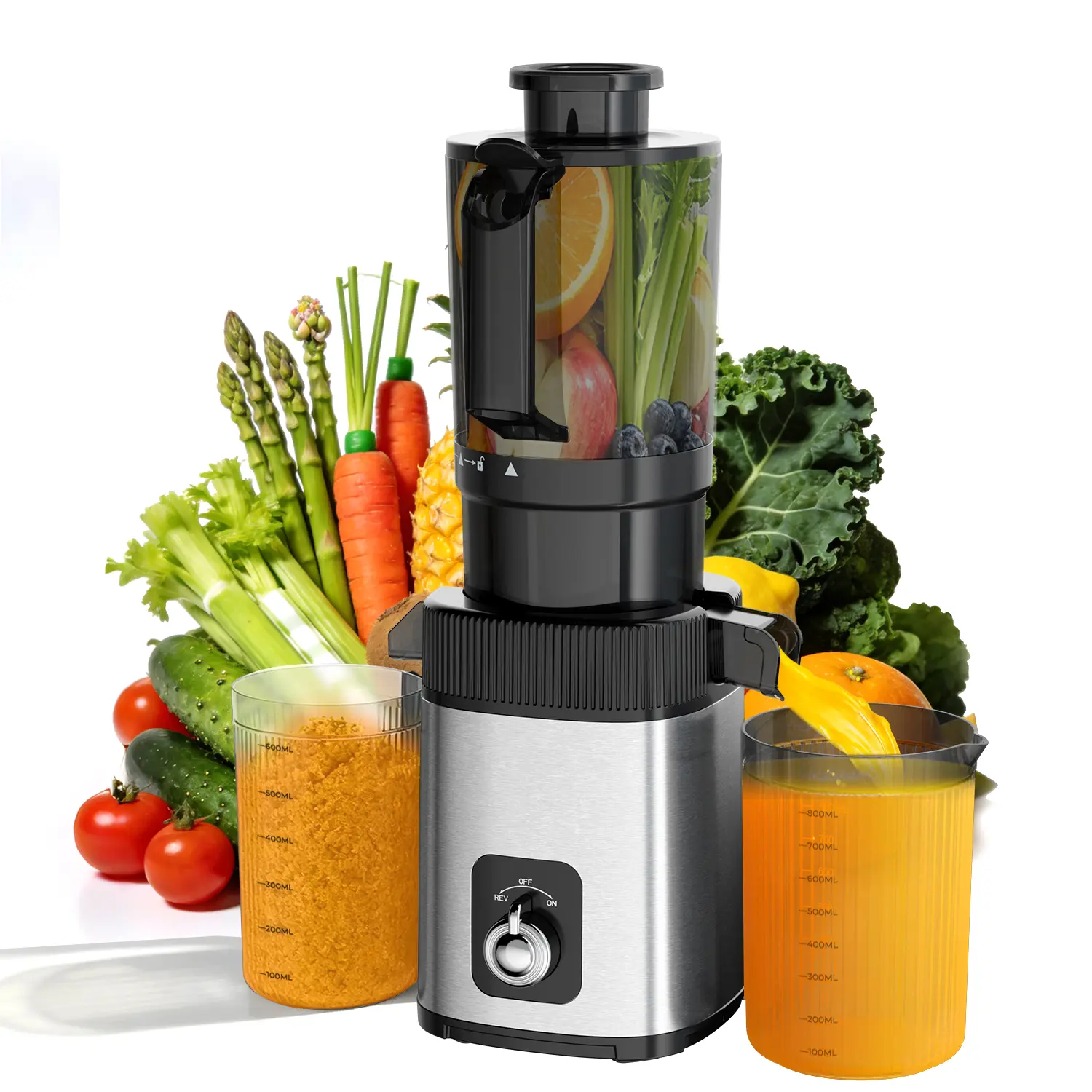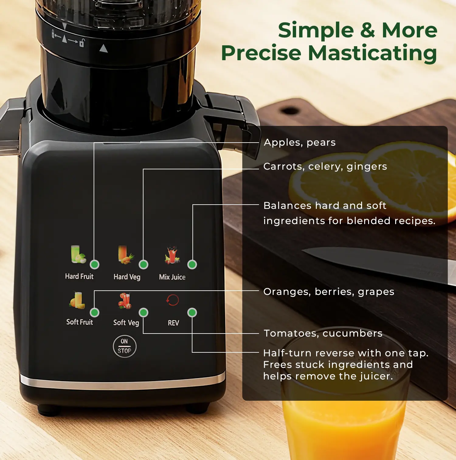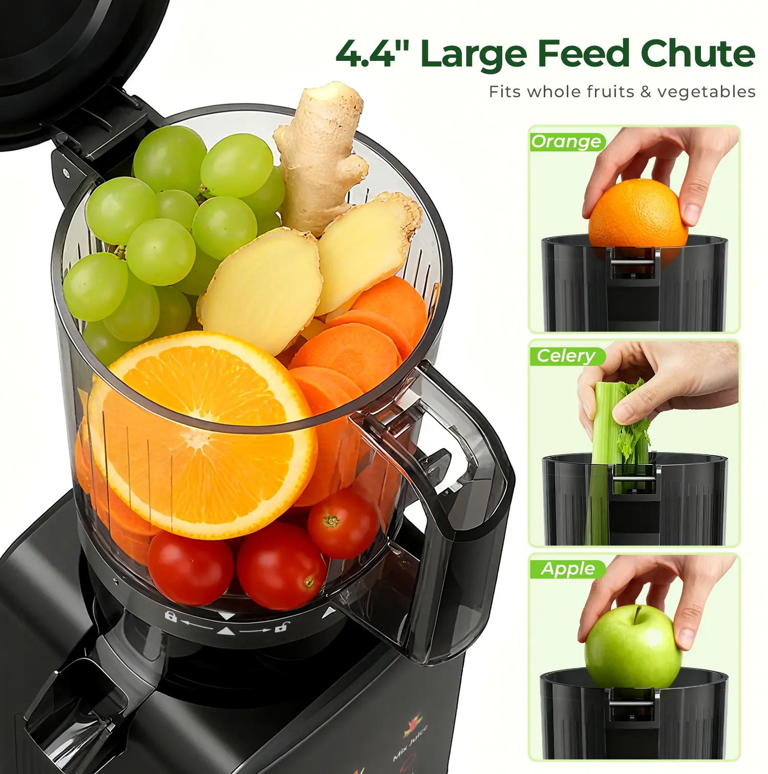 The juicer features an easy-to-use digital control panel with a vibrant color display. Enjoy one-touch operation for soft/hard fruits, soft/hard vegetables, and mixed blends. Elevate your juicing experience with effortless ease. The intuitive design ensures you can operate it with ease.