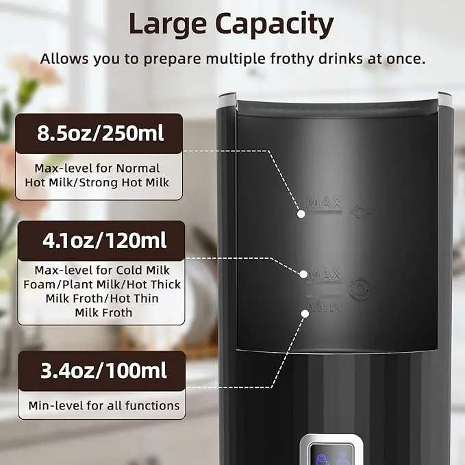 ·Prepares up to 8.5 oz (250ml) of hot milk or 4 oz (120ml) of foam. The 100ml minimum allows for smaller, concentrated drinks, with zero waste. 🍵