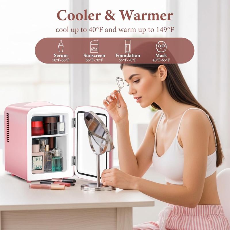 Compact & Portable Construction 🚚- Lightweight body with 4L capacity- Saves space- Easily placed on a desk, bedside table, or in a car- Rugged and stable structure- Consistent performance for storing skincare items, cosmetics, beverages