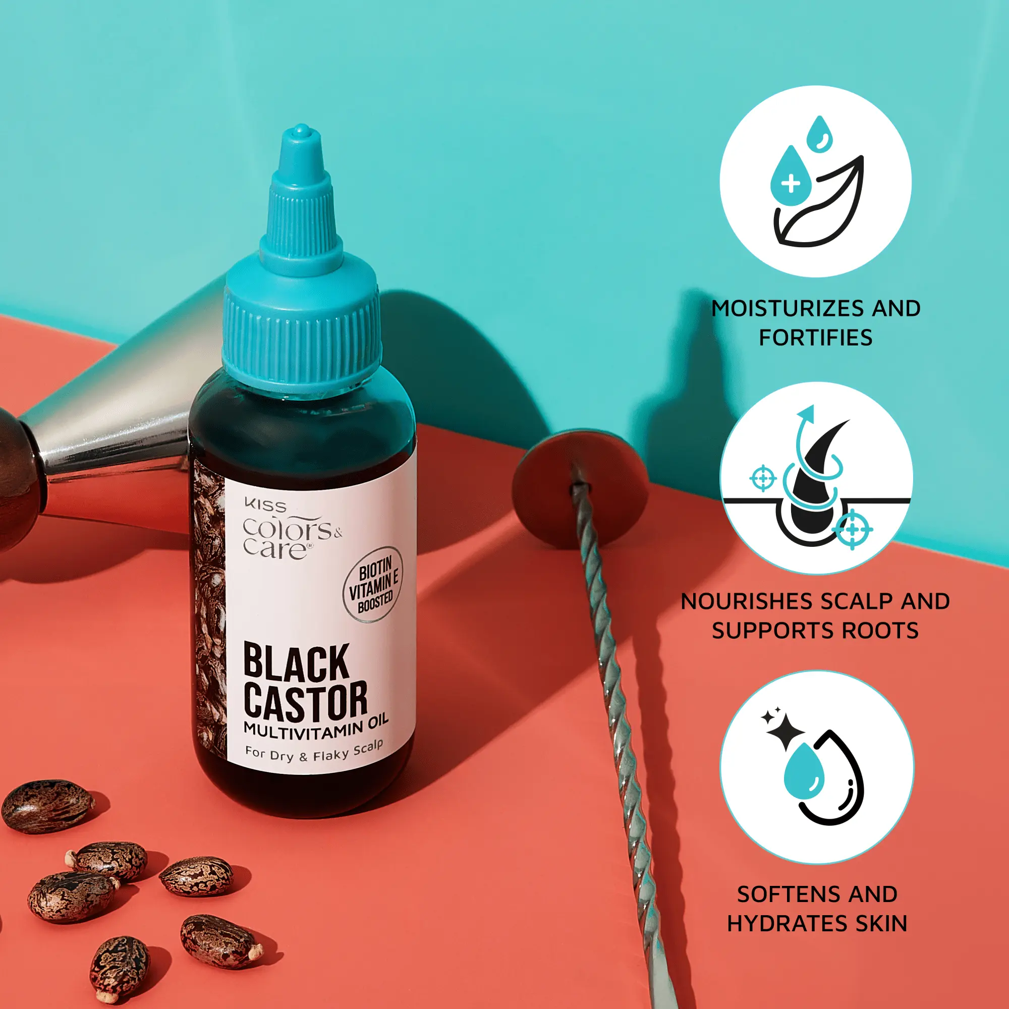 Nourish and rejuvenate your hair and skin with KISS Colors & Care Black Castor Multivitamin Oil. Formulated to nourish & strengthen hair & deliver intense hydration to relieve dry & flaky scalp & skin. Pre-blended oils to boost and lock in moisture.