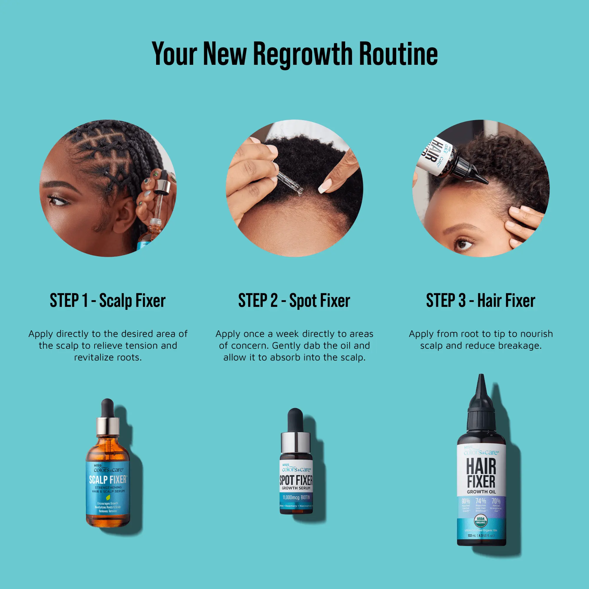 Colors & Care Hair Growth Trio nourishes textured hair, strengthens follicles, and promotes growth. This 3-step system includes Scalp Fixer Serum, Spot Fixer Growth Serum, and Hair Fixer Growth Oil to reduce breakage and improve moisture retention.