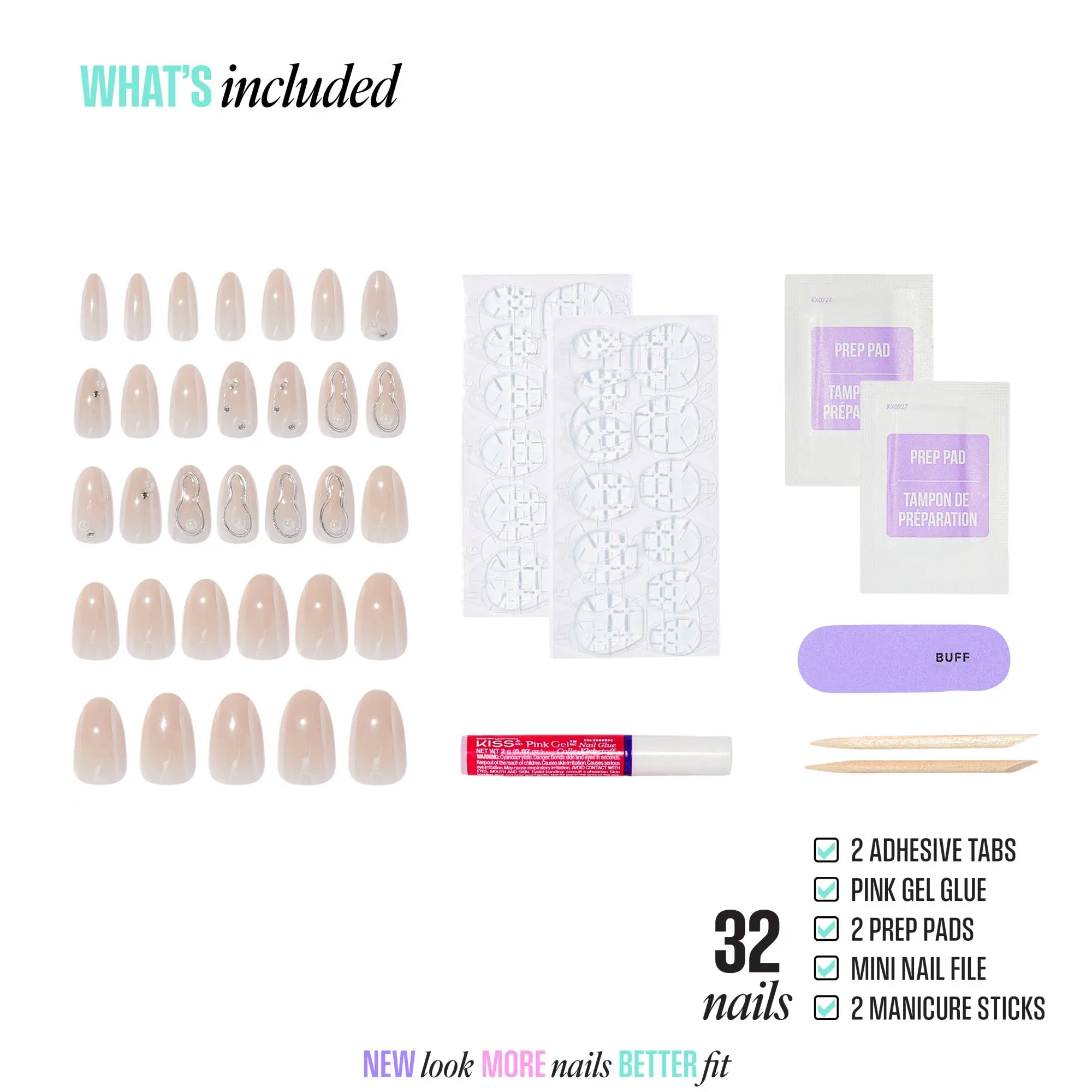 Comes with everything you could need for temporary and permanent placement. The fit is good and they feel like real acrylic nails. The design is cute and they come with lots of nails!