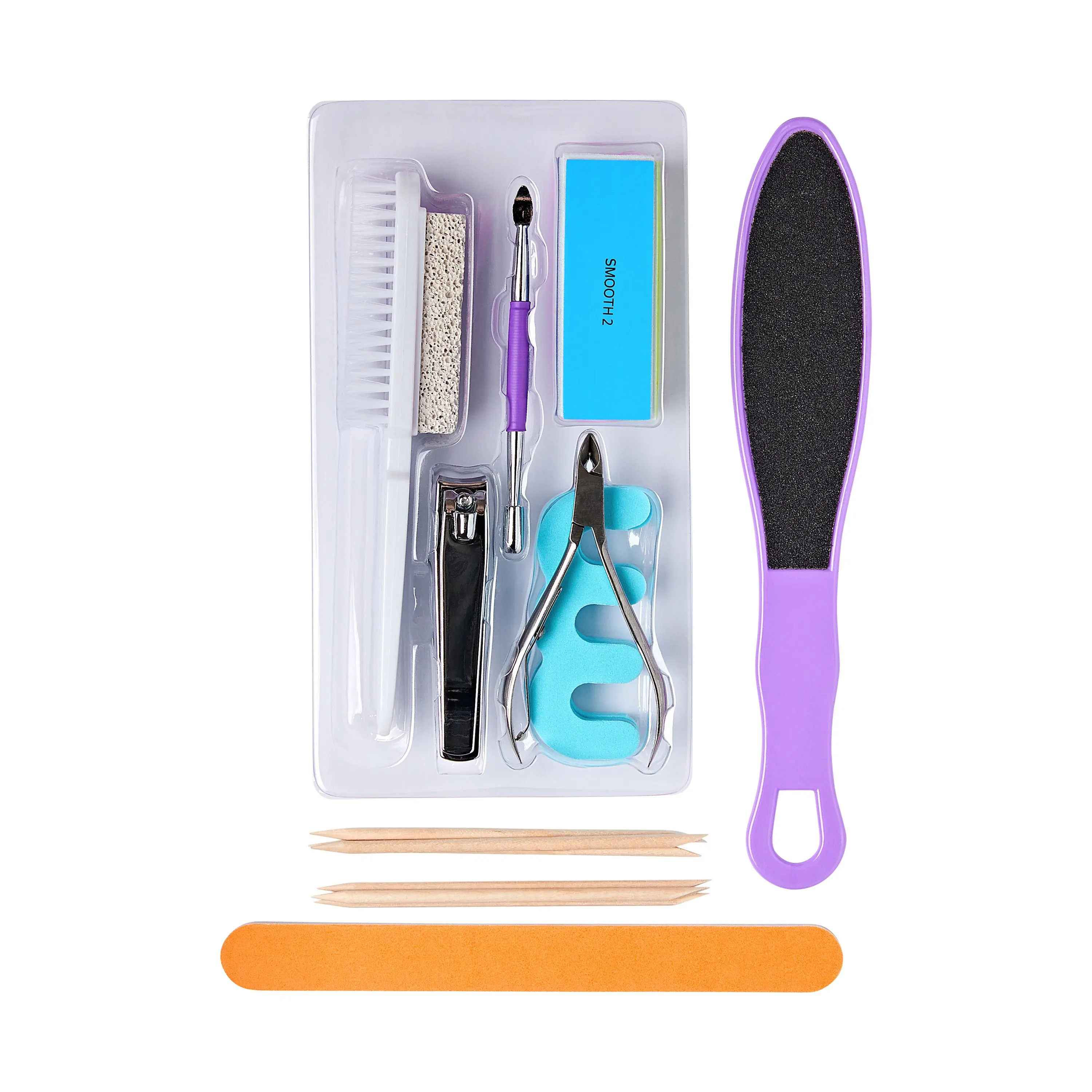 ·Includes: Toenail Clipper, Cuticle Nipper, Foot Brush & Stone, Cuticle Pusher & Cleaner, Large Paddle Skin Smoothing File, 2 Toe Separators, Large Nail File, 4-Way Buffer, 6 Wood Manicure Sticks, Travel Pouch