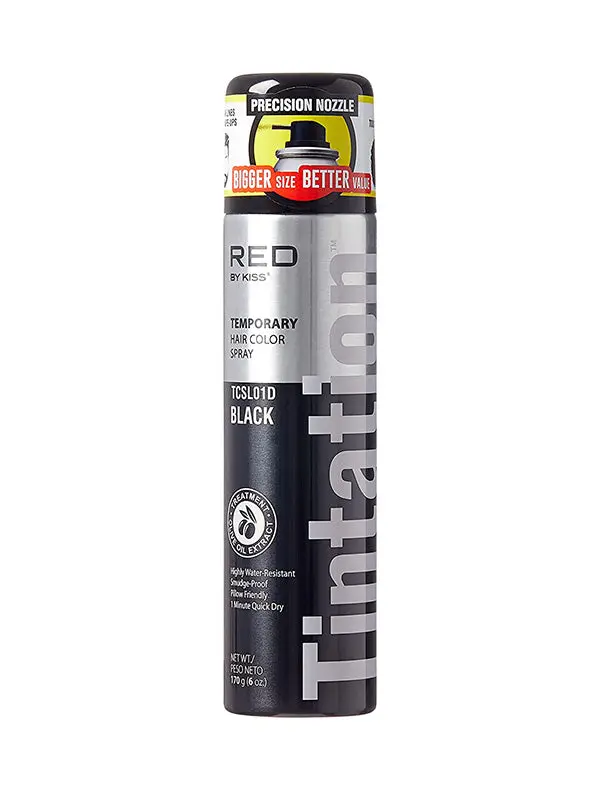Transform your look in moments with Kiss Tintation Temporary Hair Color Spray, a 2.82oz burst of color that's as versatile as it is vibrant. Specially crafted with the nourishing touch of Olive Oil, this Temporary Hair Color Spray offers an instant makeover, perfect for experimenting with new colors, concealing gray roots, or adding a pop of color for special occasions. Its unique formula ensures a smooth application, providing flawless coverage without the unwanted stickiness or residue.