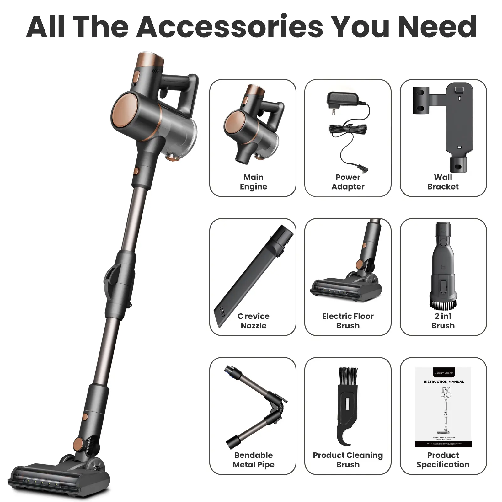 ·8-in-1 Multi-Function, All-Scenario Use: Converts to handheld/car vacuum quickly. Comes with bendable tube, rotatable floor brush, 2-in-1 brush, crevice nozzle – cleans floors (solid wood/marble/tiles), low-pile carpets, pet hair, stairs, curtains, sofas, beds, car/RV interiors. "One device replaces multiple".