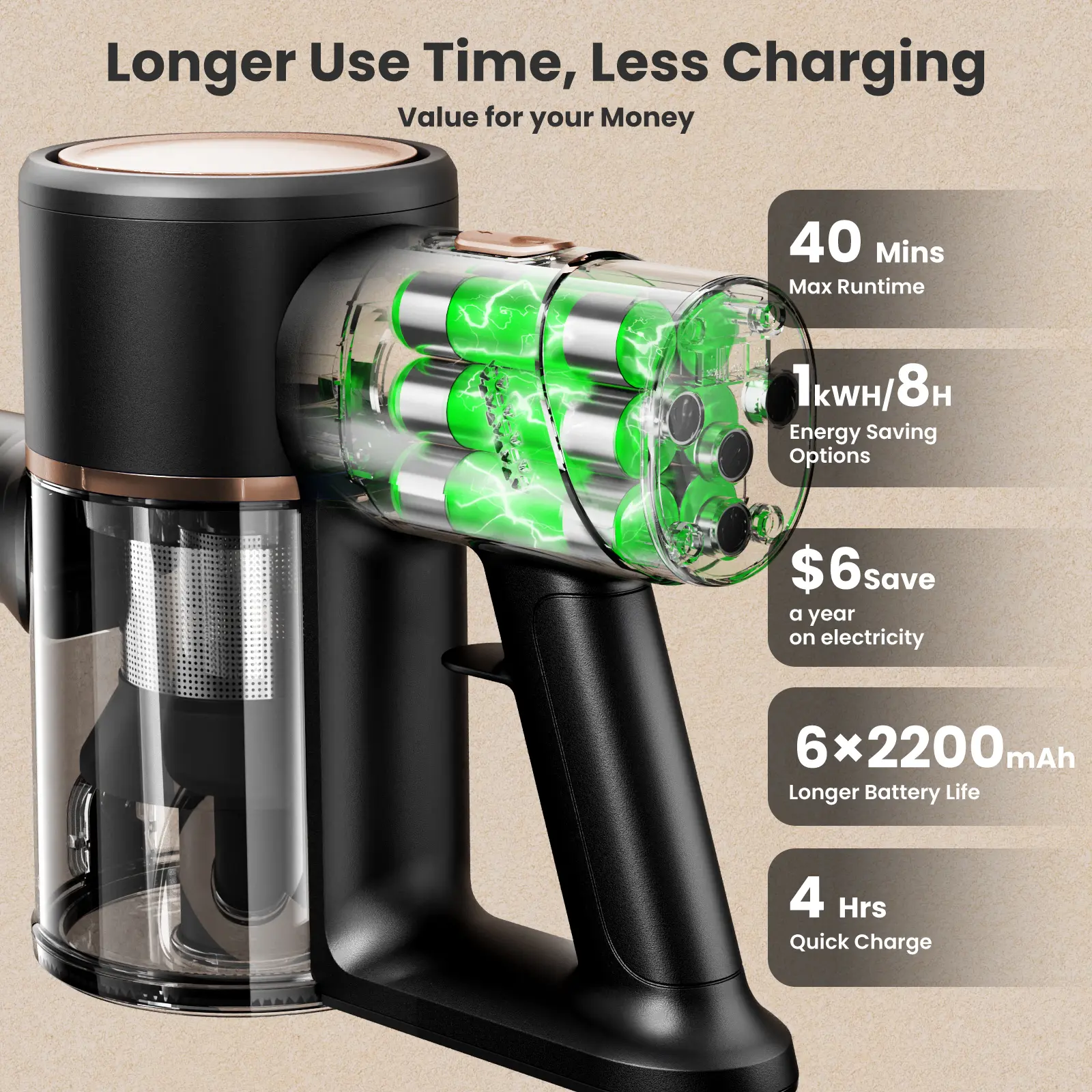·Long Runtime + Energy-Saving, Cost-Effective: 6×2200mAh lithium batteries +140W brushed DC motor – 40 mins runtime (standard mode)/20 mins (turbo mode), covering 180㎡ (≈1937.5 sq.ft) easily. Saves ~$6 annual electricity cost; fully charges in 4-5hrs (runtime varies by usage/accessories).