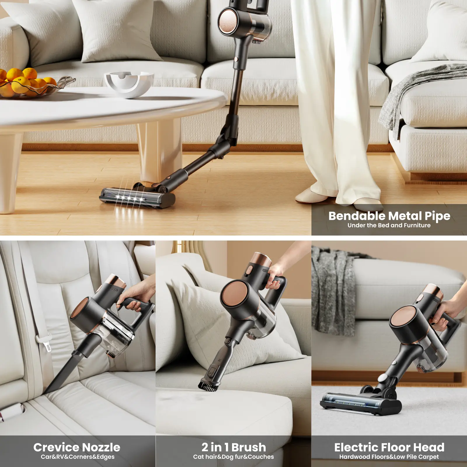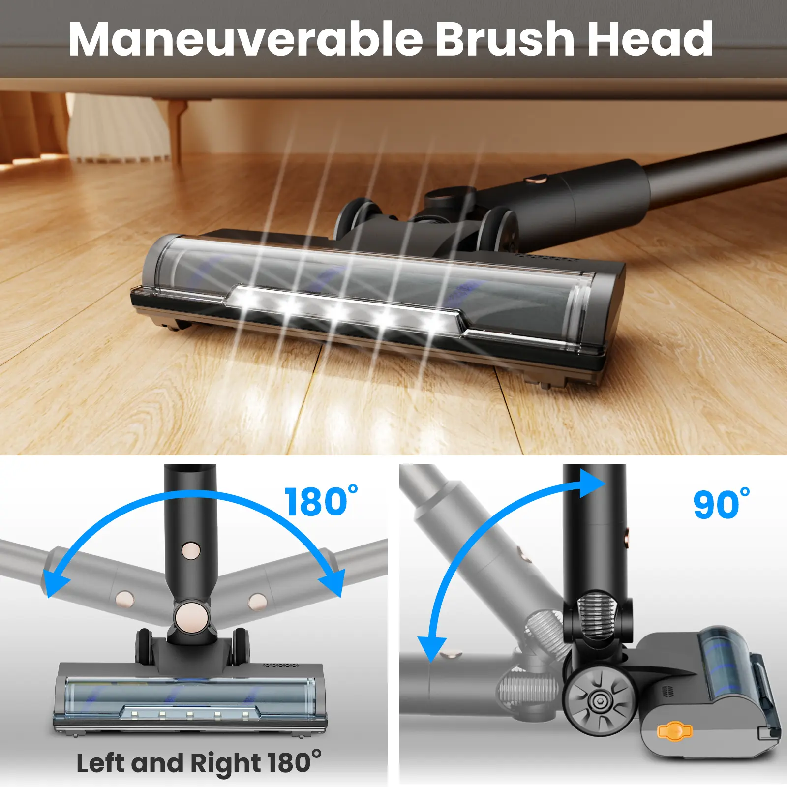 ·Smart Display + Lighting, Clear Cleaning: Touch-sensitive LED screen switches 15Kpa standard /29Kpa turbo mode, shows real-time battery to avoid sudden power-off. 5 built-in LED lights on floor brush illuminate hidden dust under wardrobes/sofas.