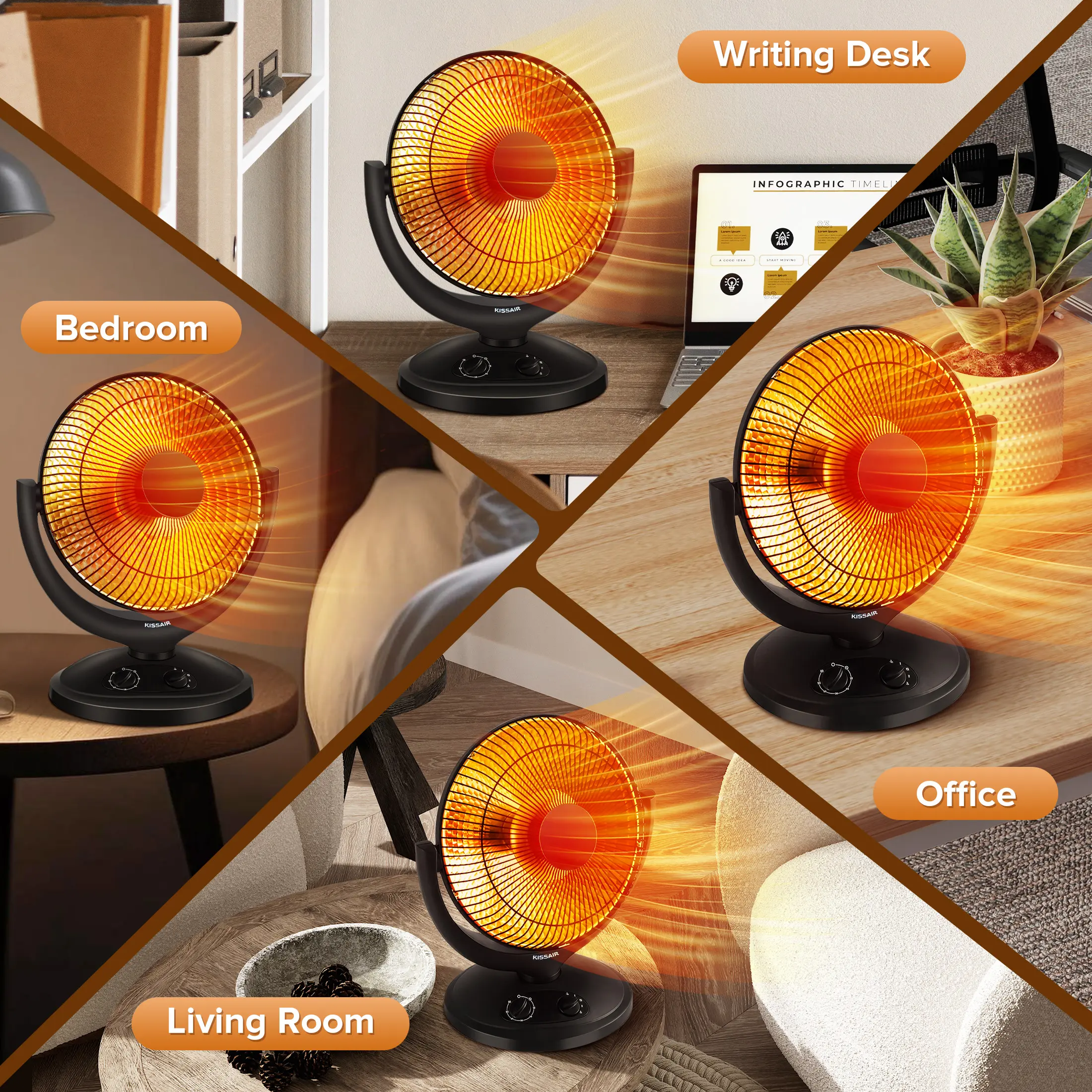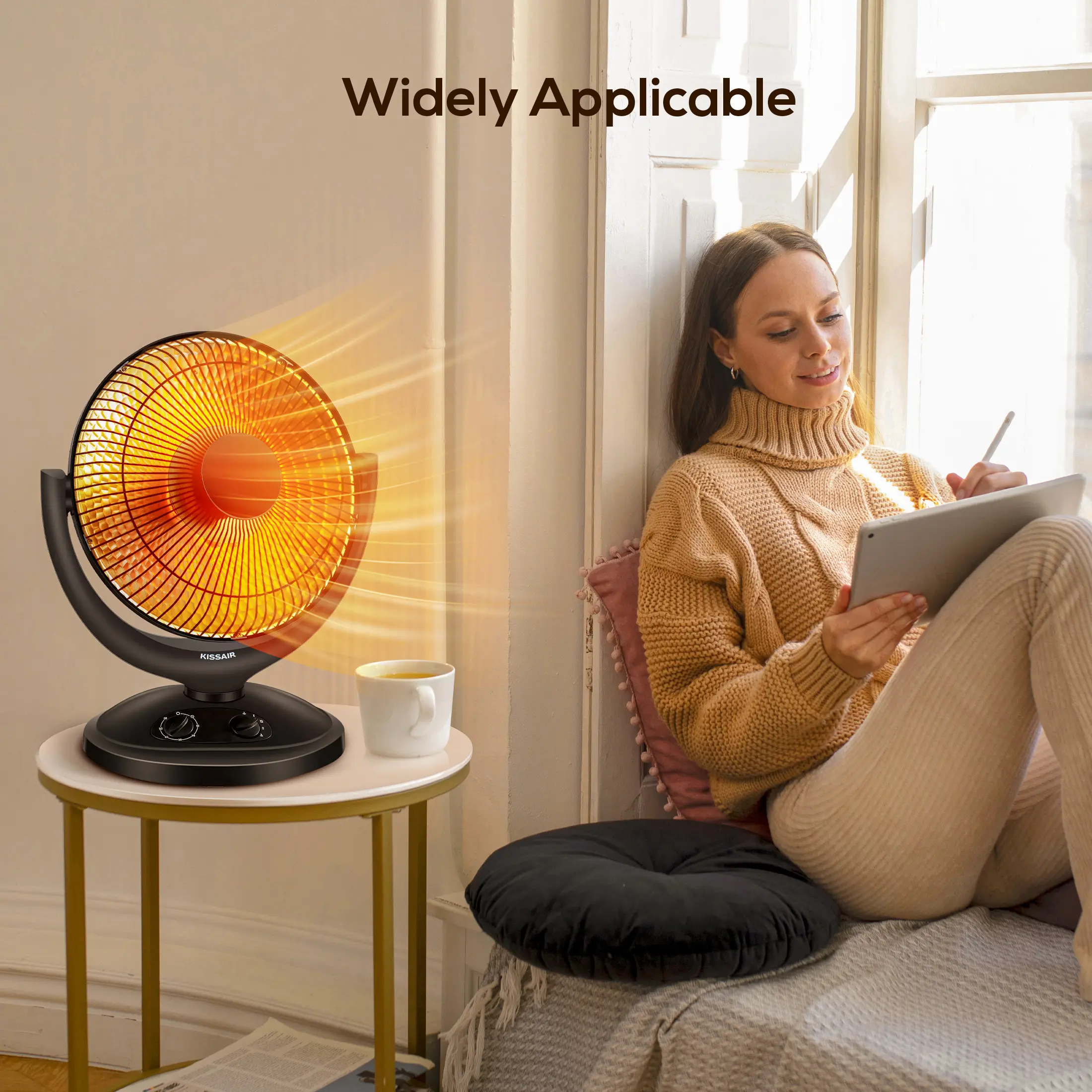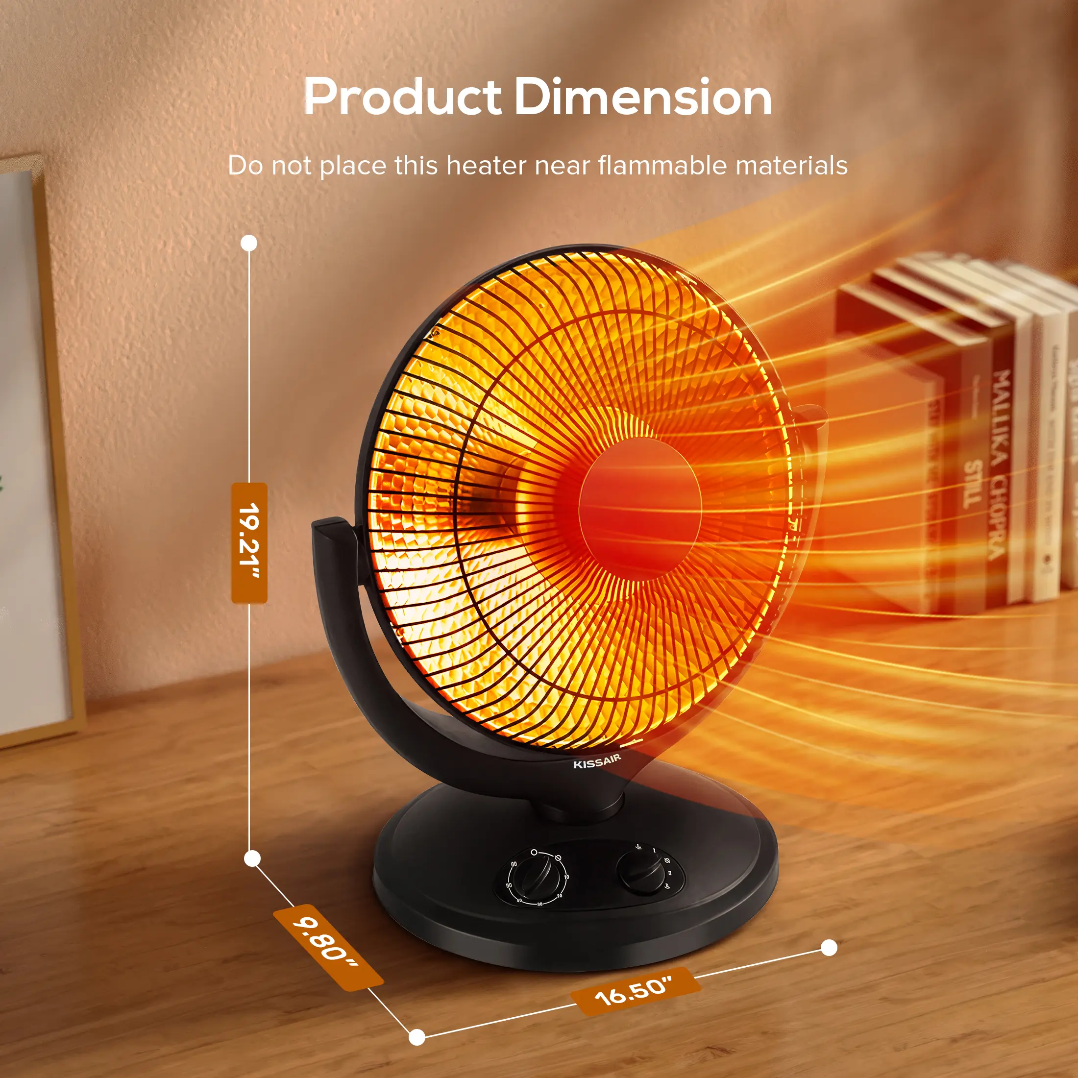 The KISSAIR Radiant Dish Heater measures 16.54 (L) x 9.84 (W) x 18.90 (H) inches and weighs only 3.96 lbs. Its compact size makes it easy to move and place anywhere. The heater is designed for convenience and versatility, suitable for various surfaces like countertops, desks, floors, or tables.