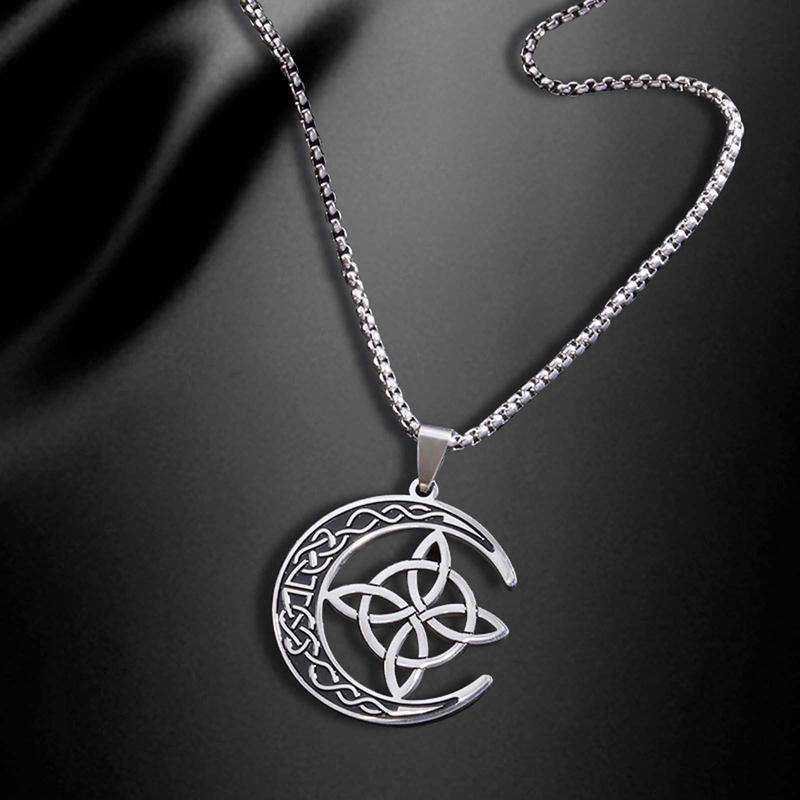 This necklace features a moon Celtic knot cross design. It's crafted from stainless steel, ensuring durability. Perfect for men and women, it serves as a protective piece of accessories. The unique knot cross adds a touch of elegance. Ideal for everyday wear or special occasions.