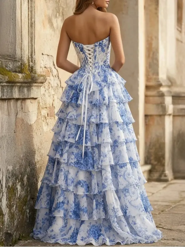 5. Kissprom Dresses Haruko A Line Floral Blush Tiered Chiffon Long Corset Prom Dress with Slit