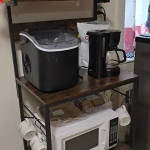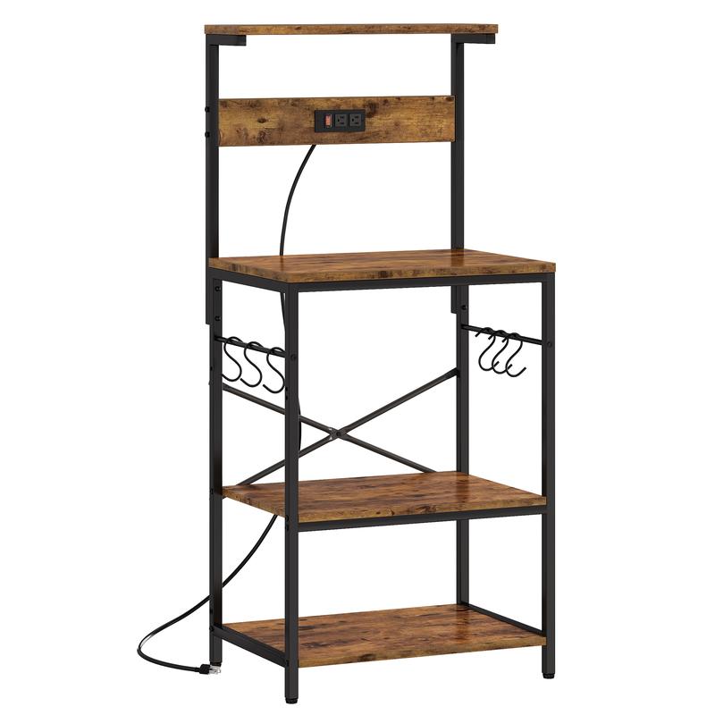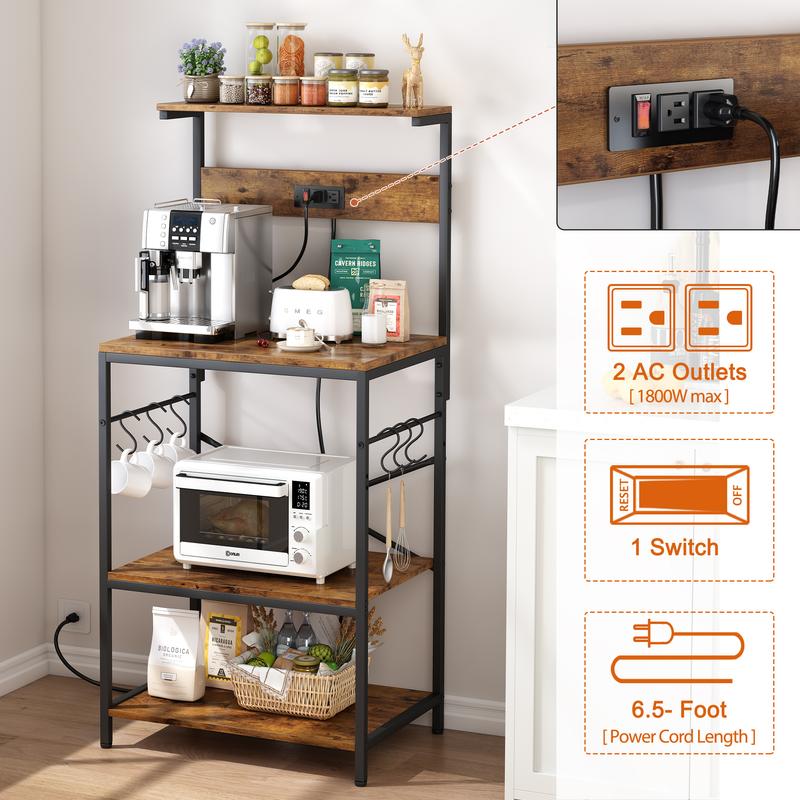 SUPERJARE Kitchen Bakers Rack with Power Outlet, Coffee Bar Table 4 Tiers, Kitchen Microwave Stand with 6 S-shaped Hooks, Kitchen Storage Shelf Rack for Spices, Pots and Pans