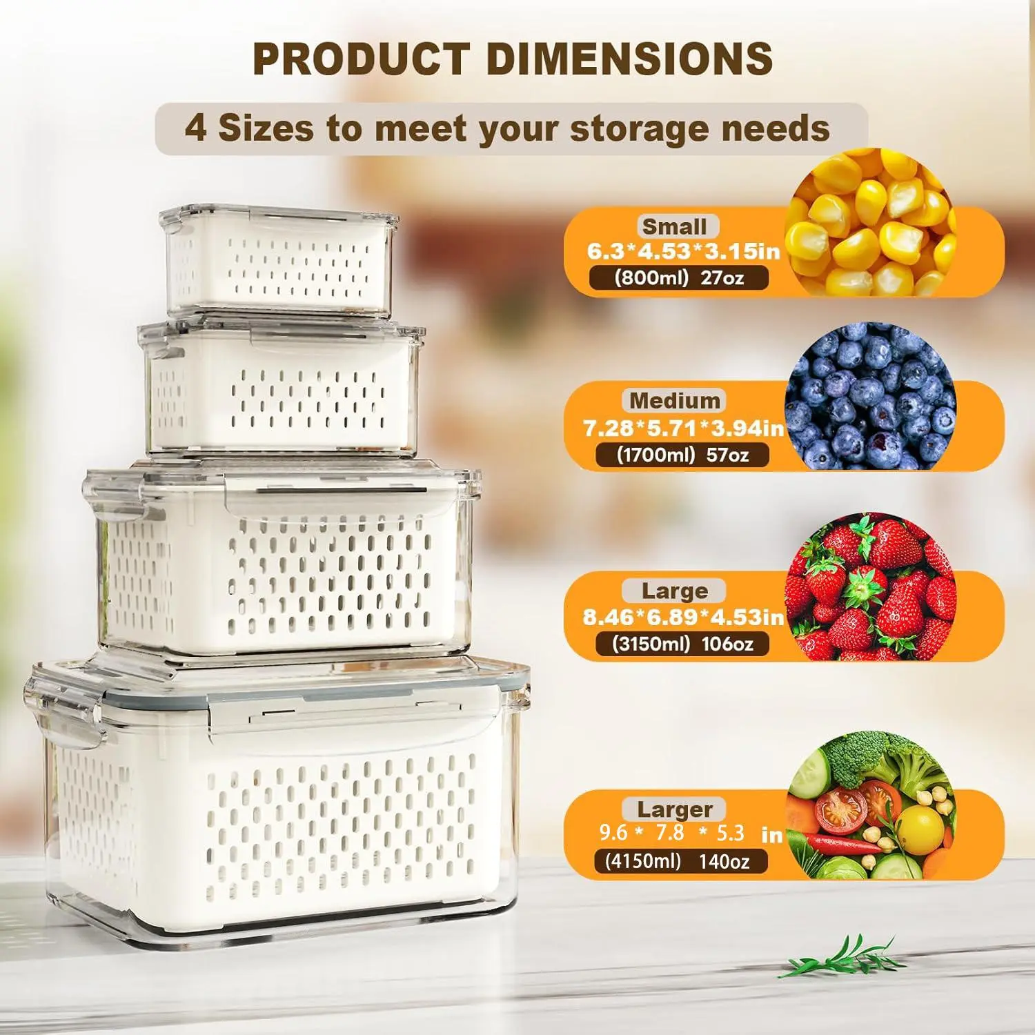 4PCS 6PCS Kitchen Colander with Removable Strainer Airtight Lid Leakproof Dustproof BPA Free Food Storage Container for Vegetable Fruit