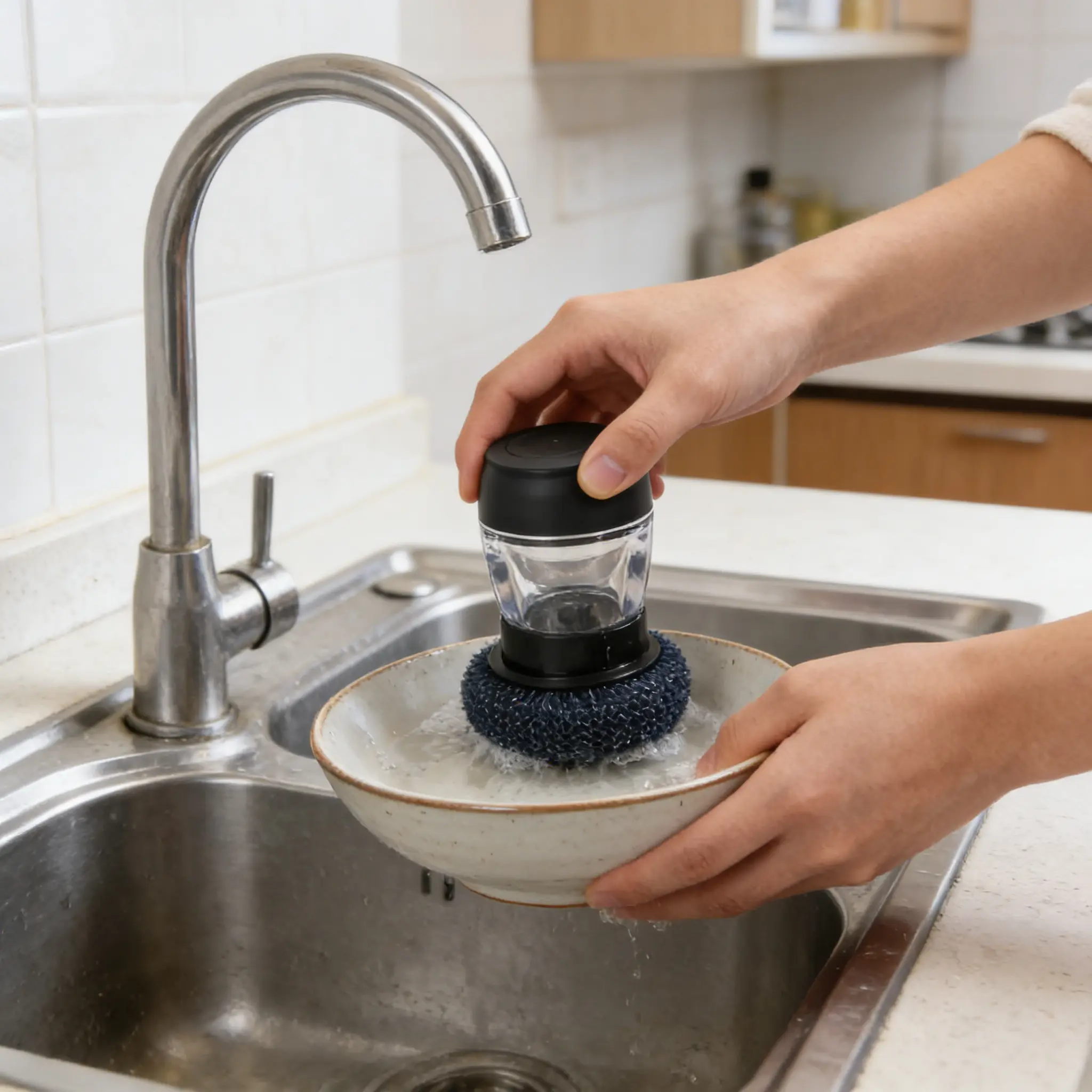 The built-in soap dispenser automatically releases the perfect amount of dish soap with every squeeze—no more messy bottles, wasted soap, or extra steps. Just load, squeeze, and clean for effortless, efficient dish care every time.