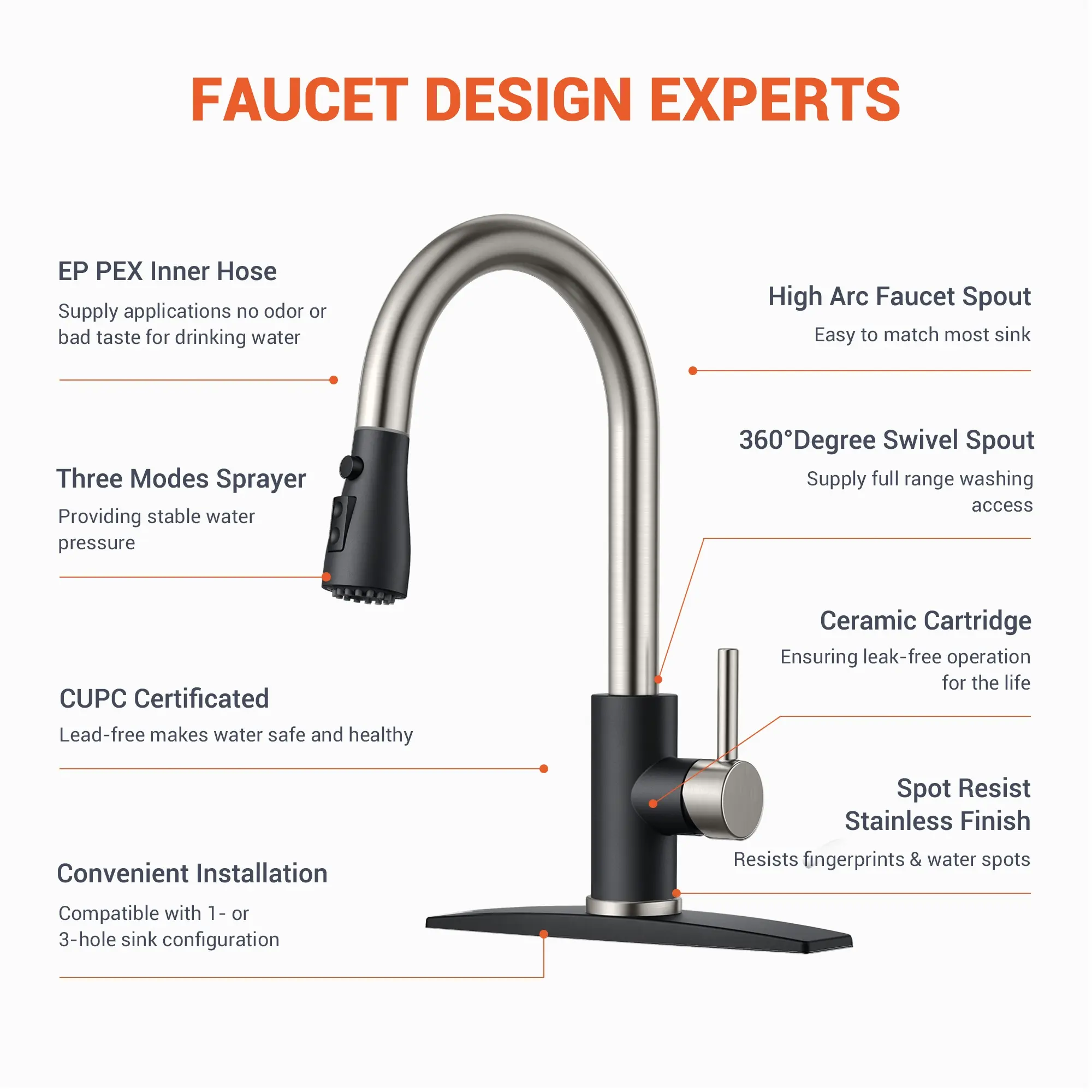 【Minutes to Install】Install this faucet easily, solo, with a 10-inch deck plate for 1-3 hole sinks, included with all hardware. Save time and money with a quick install under 15 minutes, no professional needed.