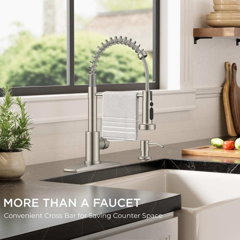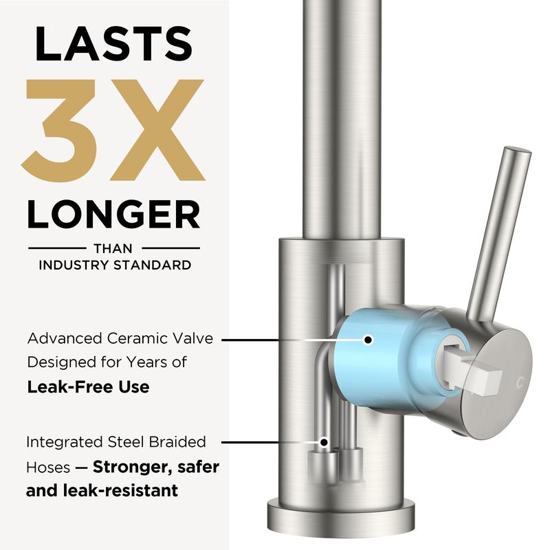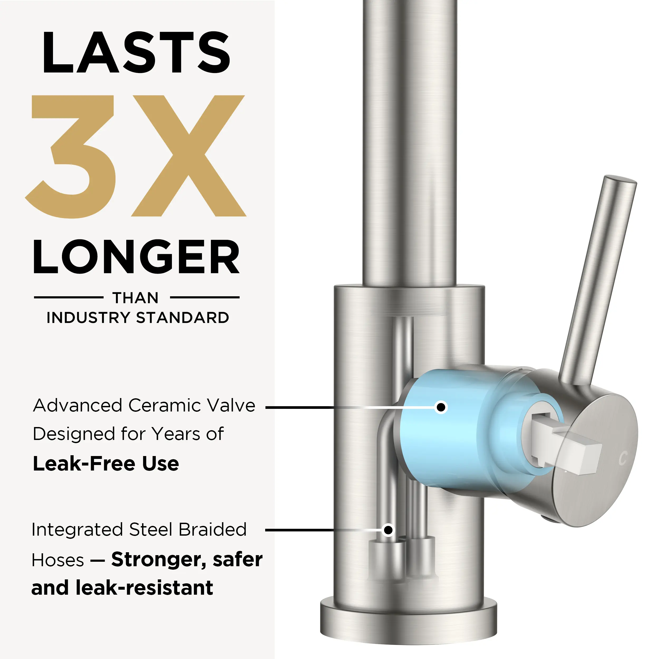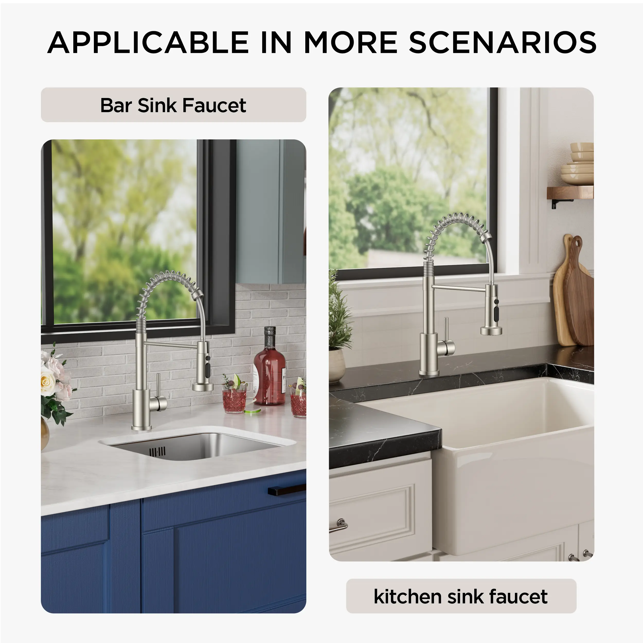 ·【Easy to clean, simplify your life】 Our stainless steel kitchen faucet with sprayer is made of a five-layer nanotechnology finish that resists corrosion and spotting, ensuring a long-lasting, pristine look. Cleaning is a breeze—just wipe with a damp cloth to reduce maintenance time.