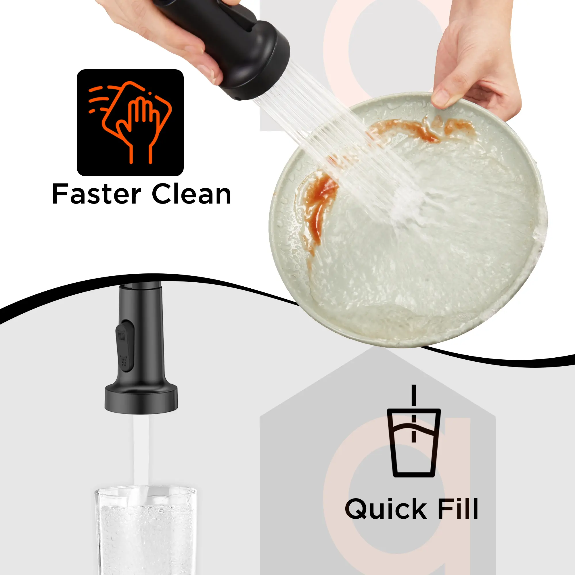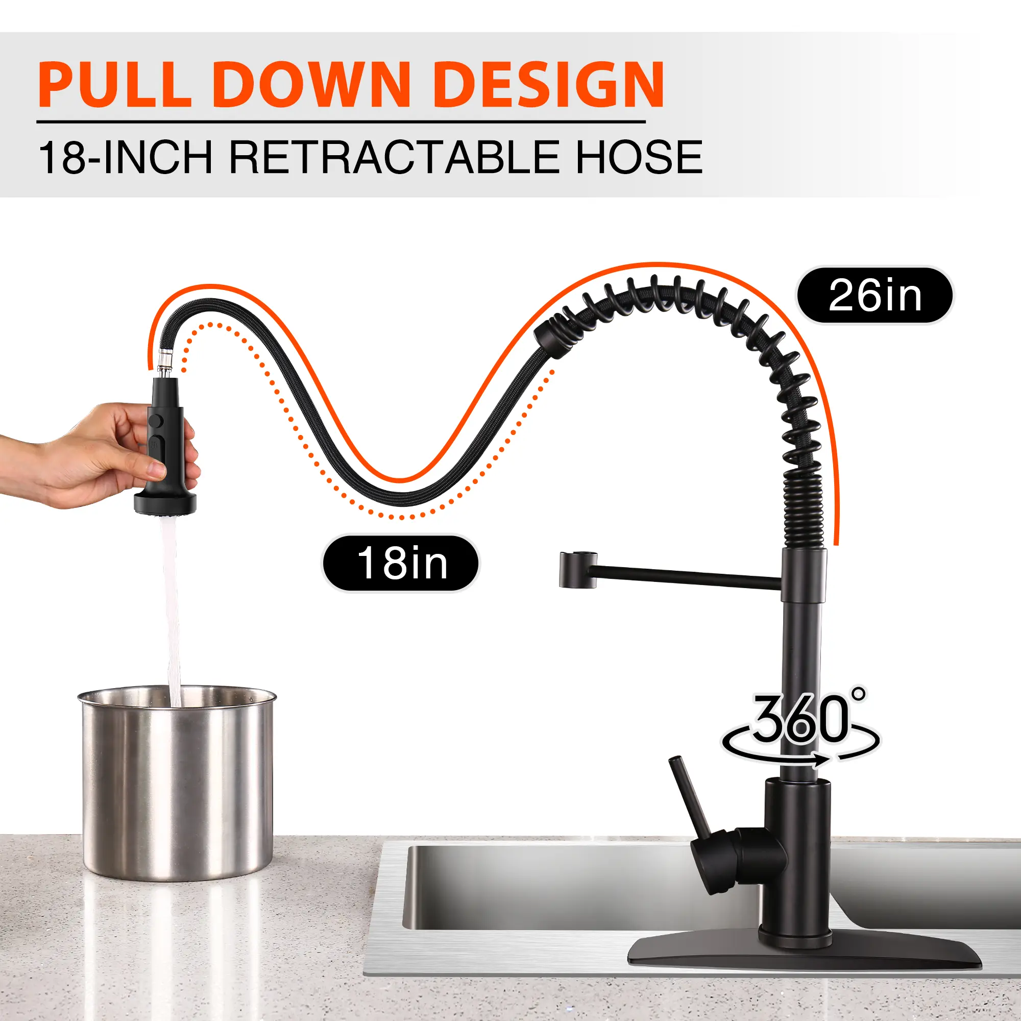 ·Stream and Spray: This faucet has two settings: Stream for filling and Spray for cleaning.