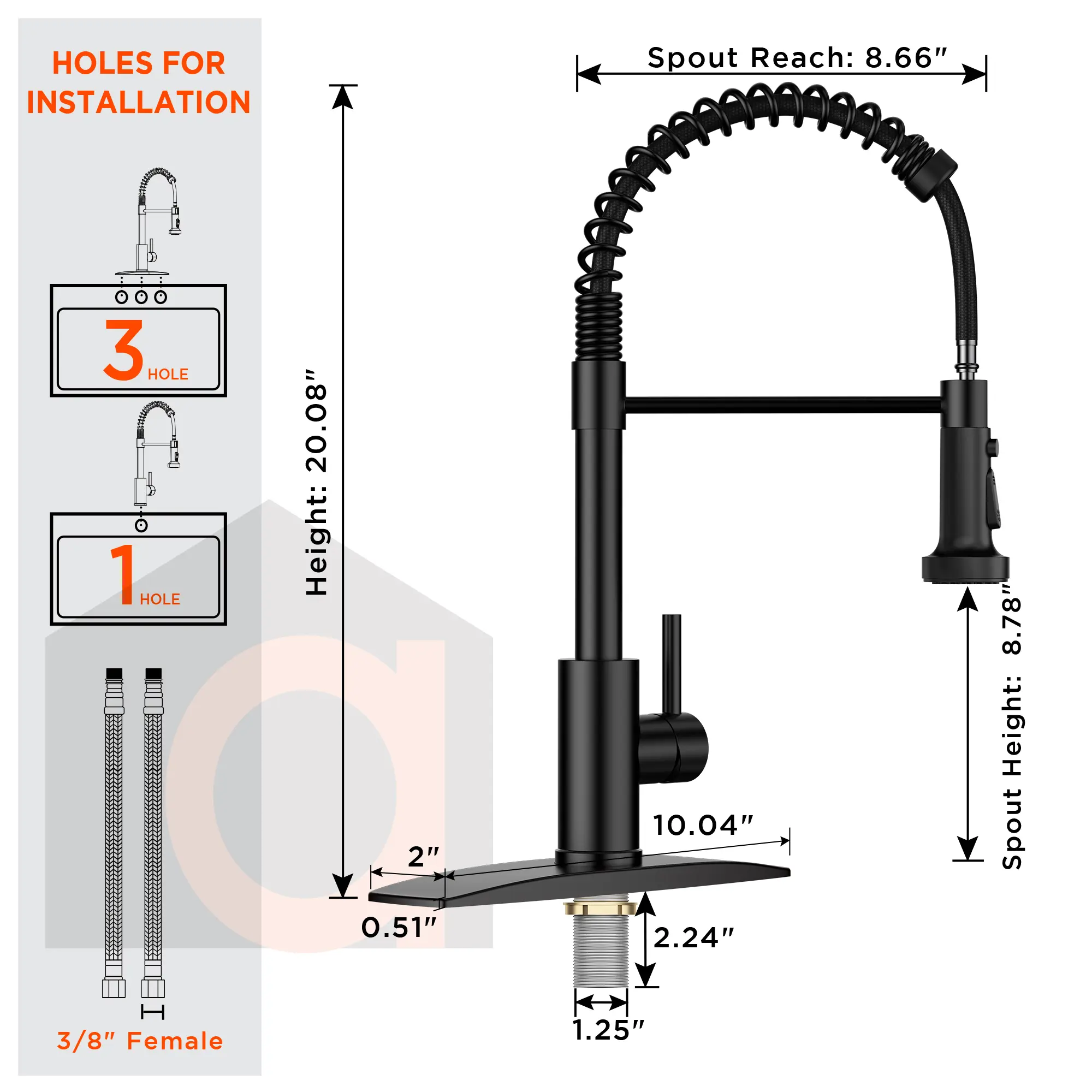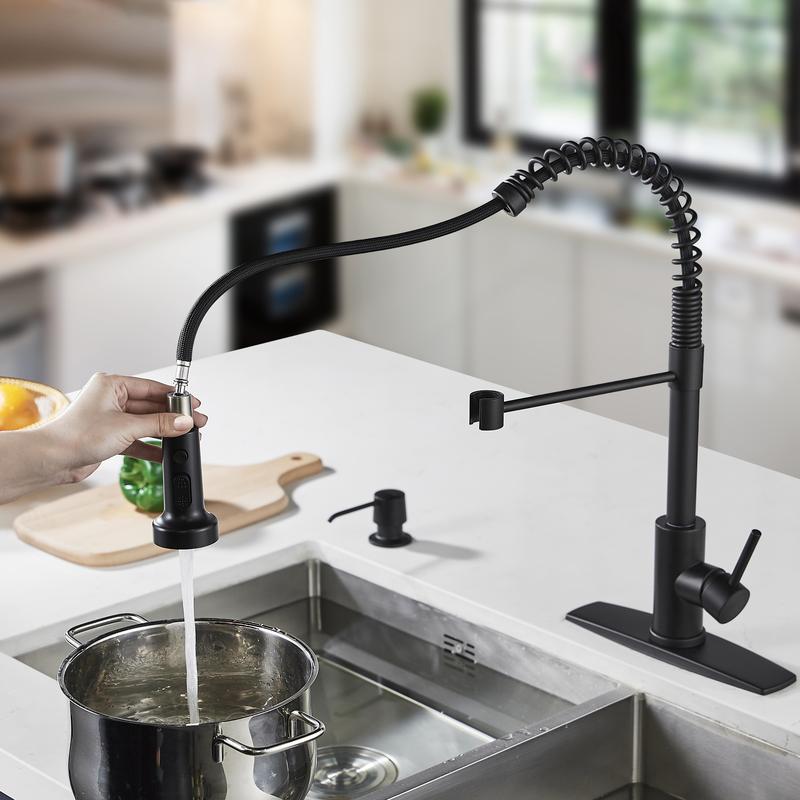 The FORIOUS Black Kitchen Faucet features a pull-down sprayer and high-pressure single handle. It is adjustable and rotated for convenience. The faucet includes supply pipes and is designed for spacious sinks. It has an overall height of 18.9 inches and a spout height of 6.89 inches.