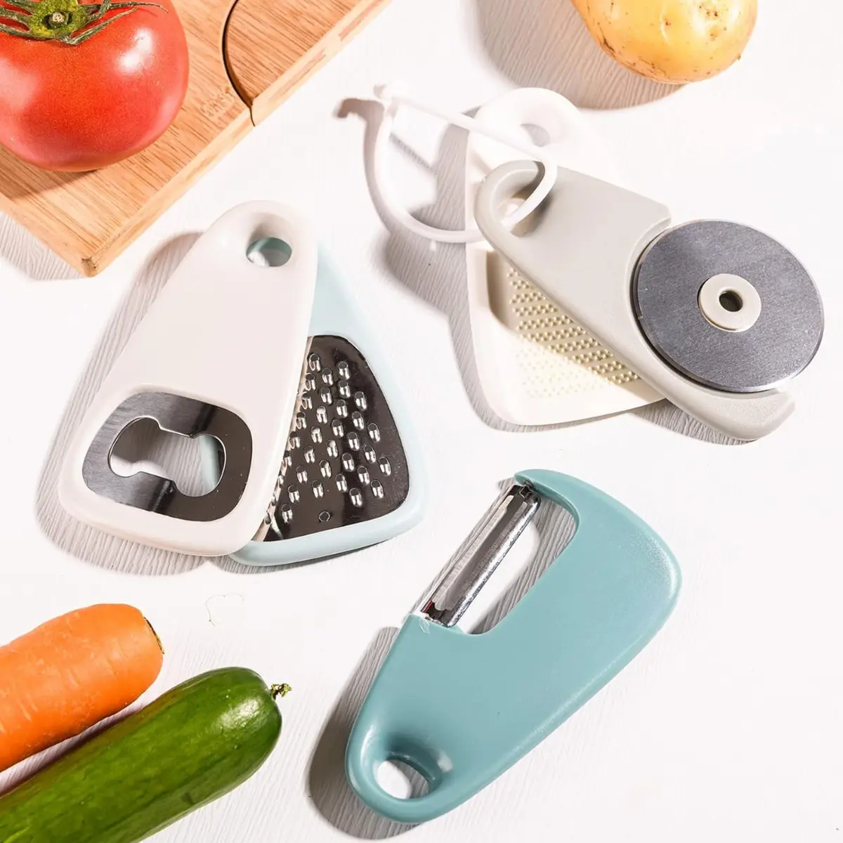 ·Complete 6-Piece SetIncludes a cheese/vegetable grater, garlic/ginger grinder, pizza cutter wheel, bottle opener, and swivel peeler—everything you need for daily kitchen tasks.