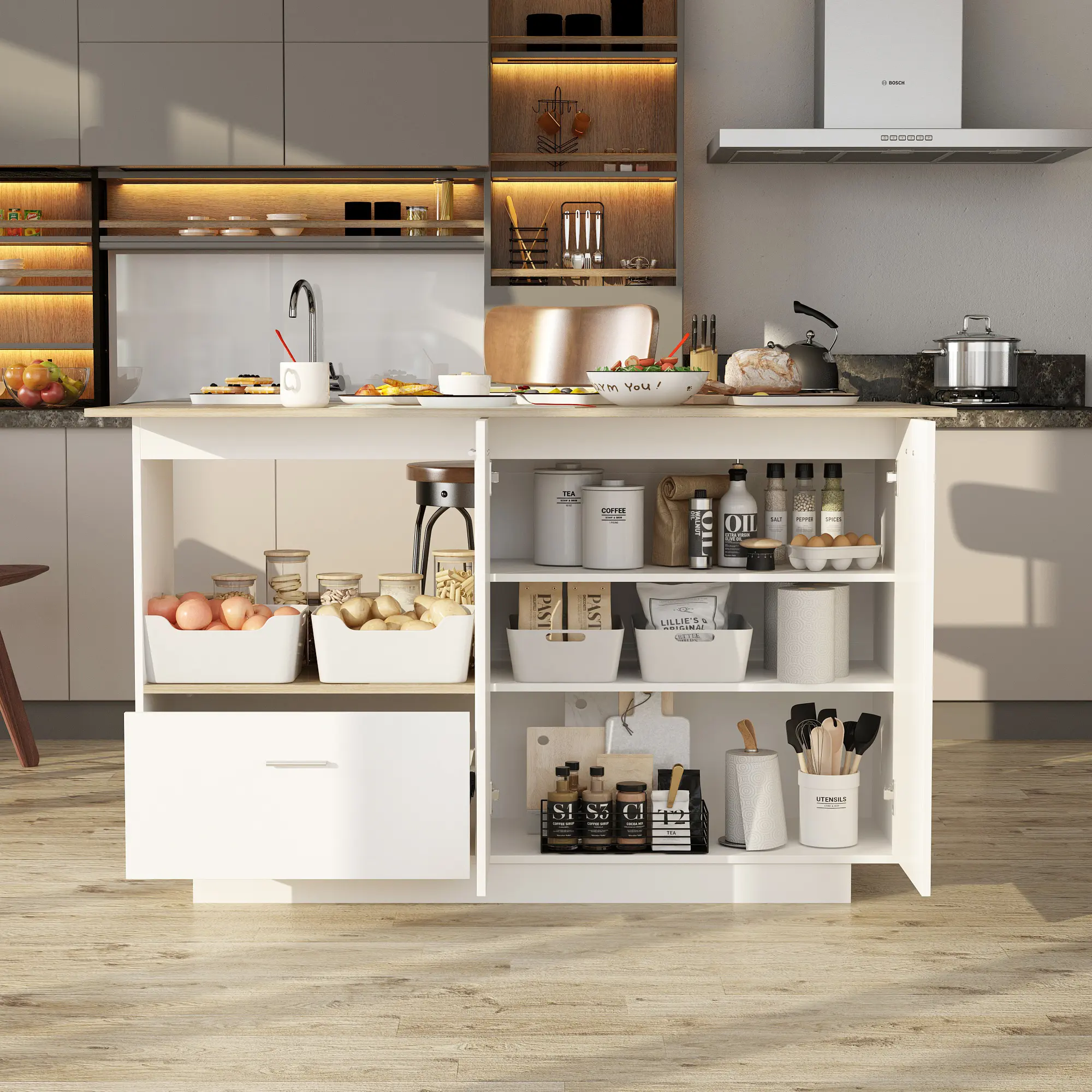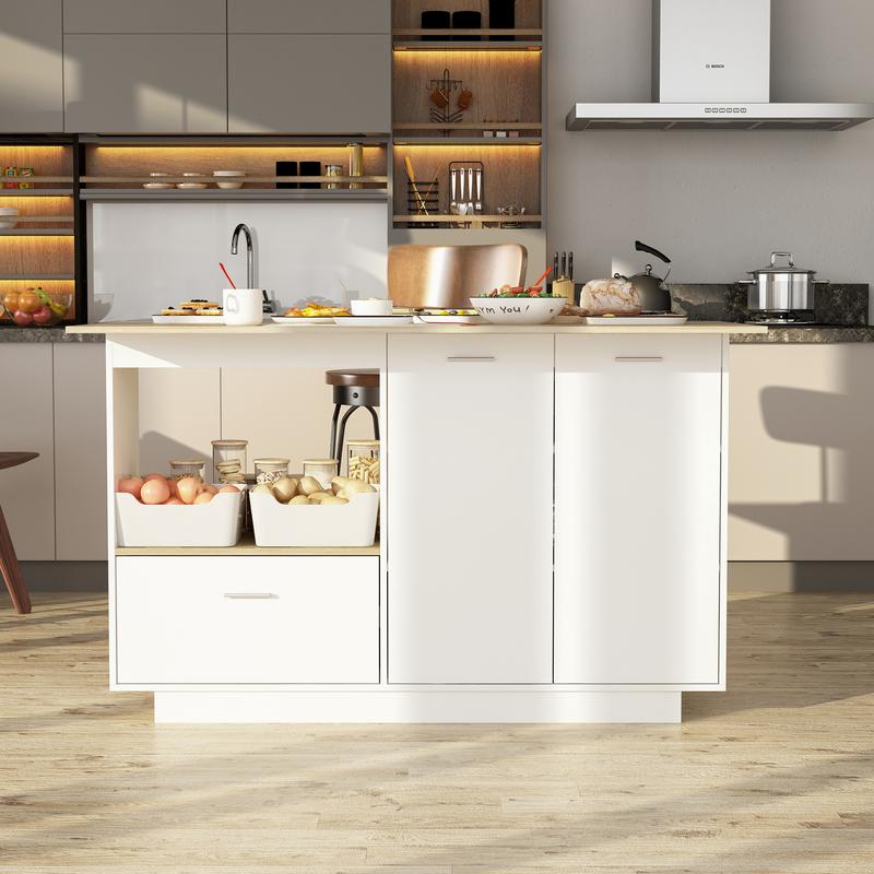 ·[Lots Storage]: Maximize the limited kitchen space with this kitchen island's thoughtful organization. This kitchen island features storage space on both sides, it features 1 drawer, 1 large open shelf and 3 hidden shelves. Space-saving design and keep your kitchen supplies away from dust.