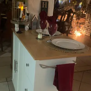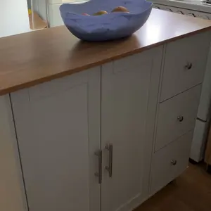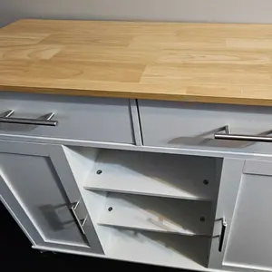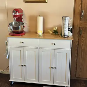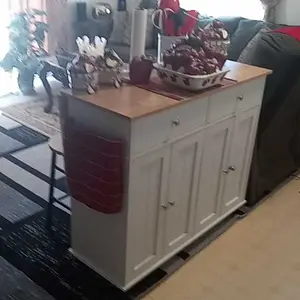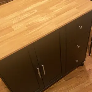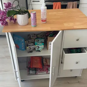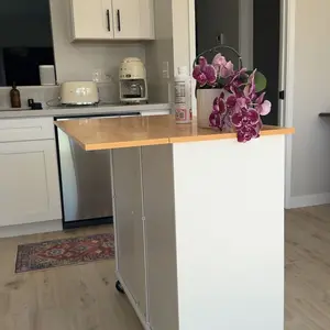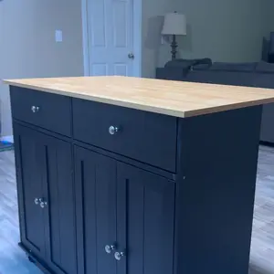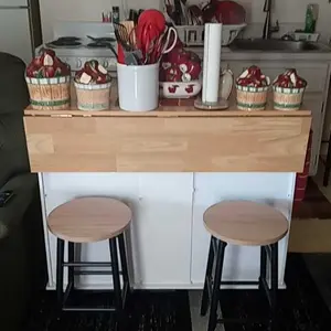 Perfect for small kitchens. Deep drawers and good storage space. The top isnât a butcher block but you can easily place your own cutting board on top. Love the extra seating option. Perfect for kids. There are a lot of pieces but the instructions are simple and straightforward.