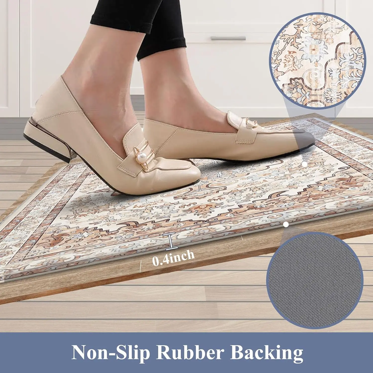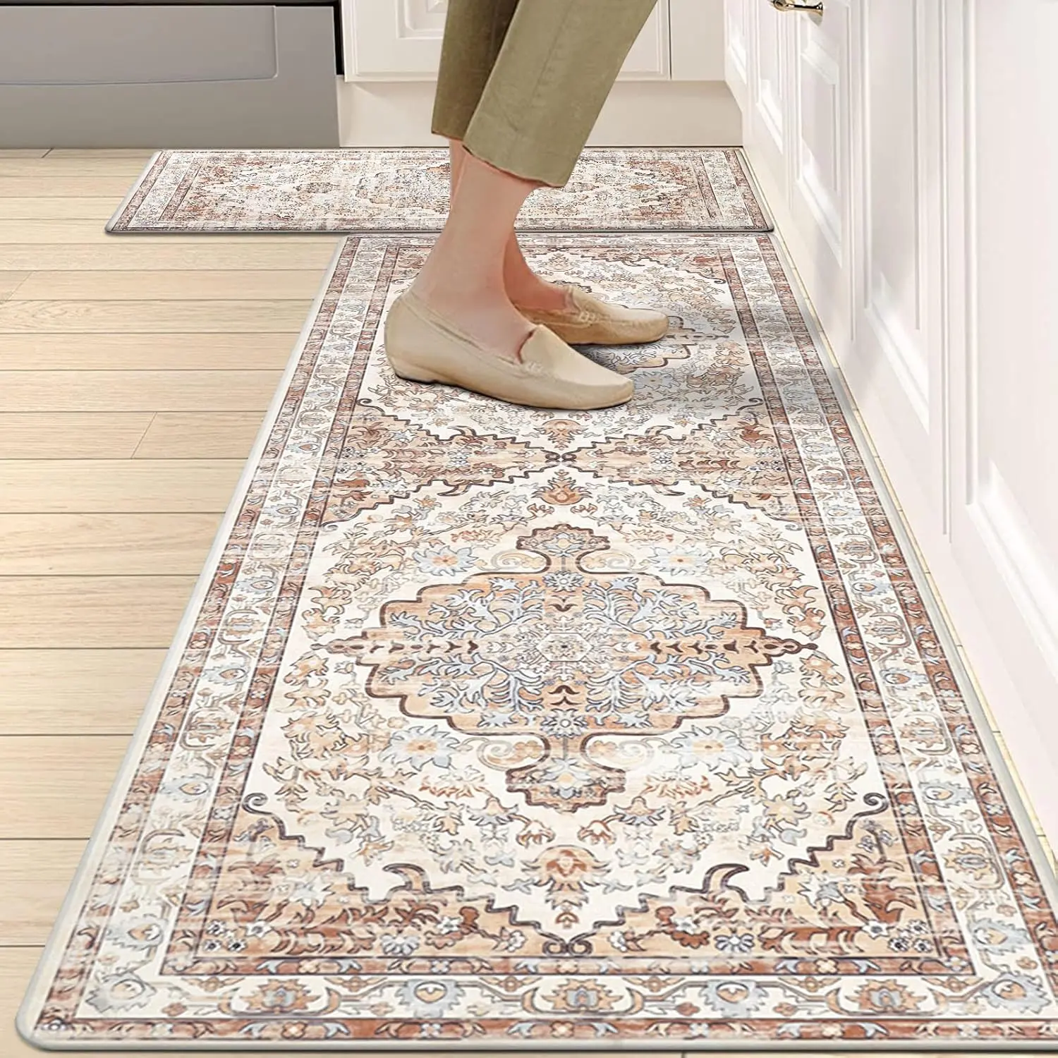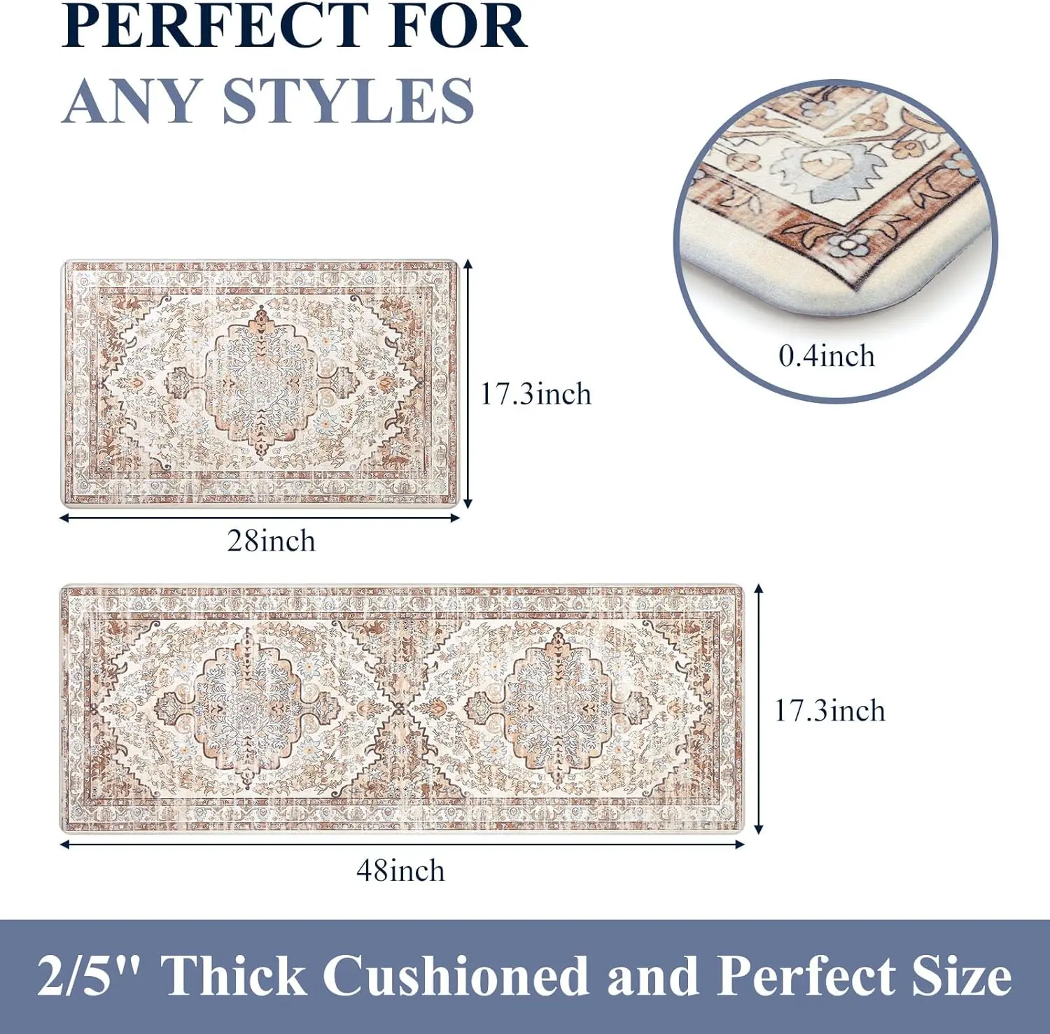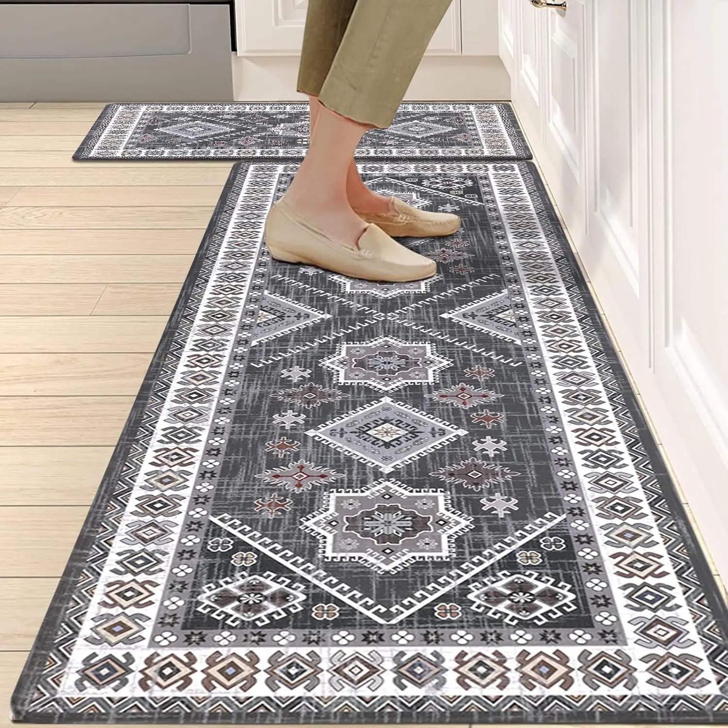 ·The LOKHOM Boho Kitchen Mats set includes two pieces: 17"x47"+17"x28"(inch) and 0.4 Inches thickness. Made of PVC material, these mats ensure shape retention even with extended use. Ideal for various purposes like standing desk mats, kitchen chef mats, doormats, bedroom rugs, and kid's room rugs. 🏠