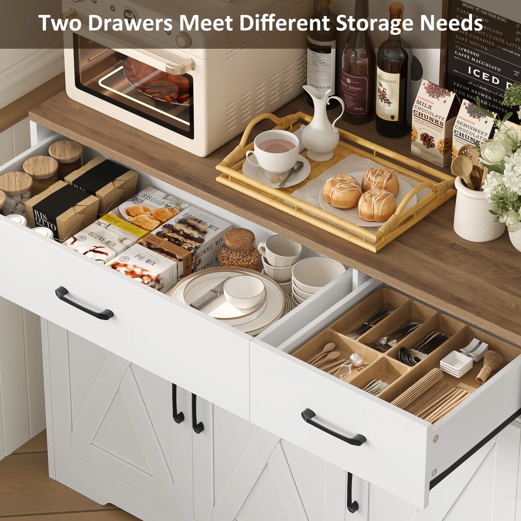 ·Crisp White Body: Adorned with barn doors and black metal handles, blending modern aesthetics with classic vintage appeal.