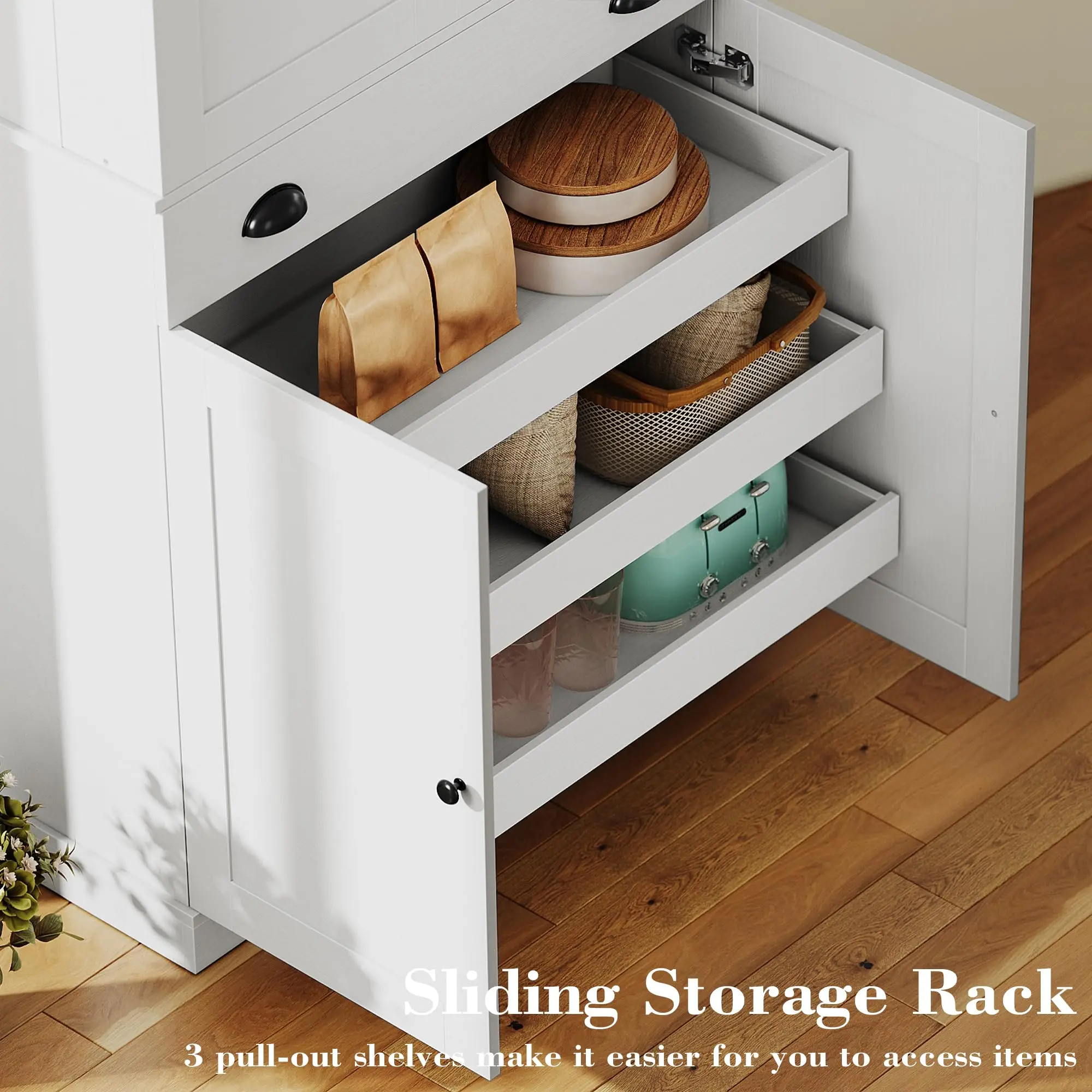 Sophisticated look, easy to put together and provides plenty of room for my pantry items. Love the pullout drawers. Thinking about purchasing a second one for my office/craft room.