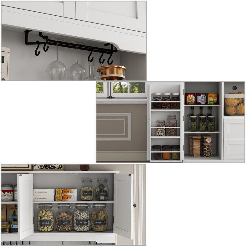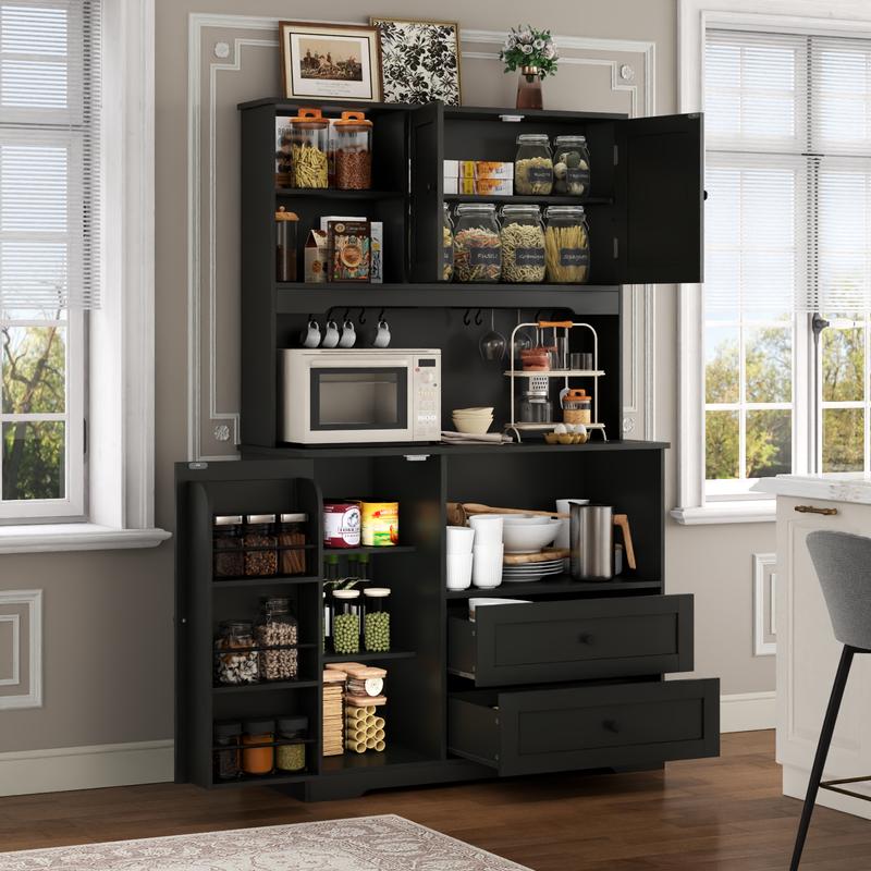 Transform your kitchen with our all-in-one modern freestanding buffet cabinet. Designed as a large kitchen pantry storage, this cabinet ensures that all your kitchen and pantry essentials have their place, hence promoting a clutter-free and organized kitchen. The versatile piece functions as a tall kitchen hutch, a food pantry cabinet, and a cupboard cabinet, offering an all-in-one storage solution that fits any scene within your home.